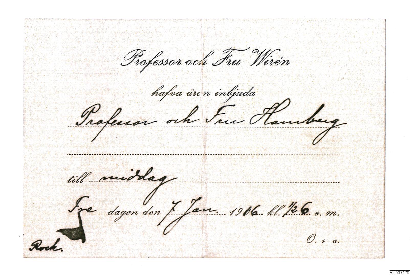 - en vikt papperbit med handskriven text "Glimmerskifvor 37 x 21 mm". Inuti papperet ligger ett inbjudningskort med texten "Professor och Fru Wirén hafva äran inbjuda Professor och Fru Hamberg till middag. Fredagen den 7 Jan 1916 kl 1/2 6 e.m. O.s.a. I nedre vänstra hörnet är skrivet med bläck: Rock". Inbjudningskortet är vikt på mitten och i det finns två glimmerskivor.