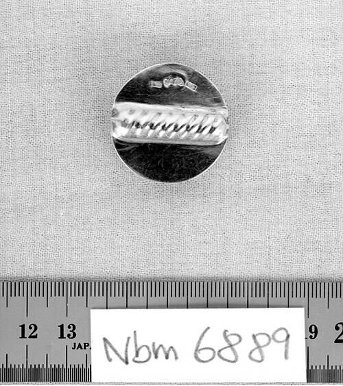 Rund, platt form med ett larvornament som sträcker sig över hela diagonalen. På baksidan en ögla för fastsyning. Stämplar: KLS-tre kronor-S-Gällivare stadsstämpel-N8. Förgylld.
