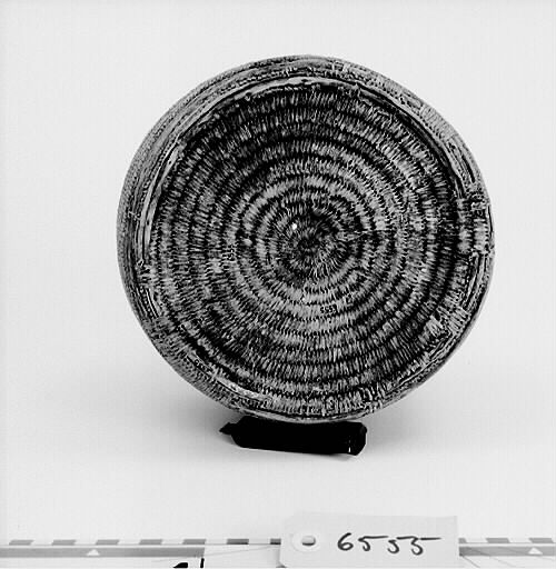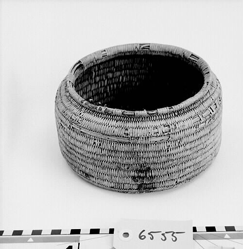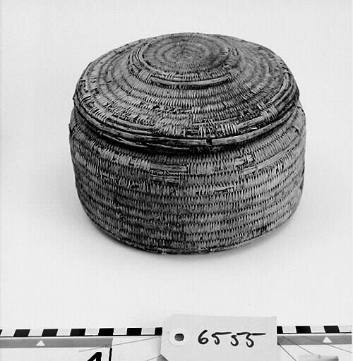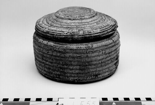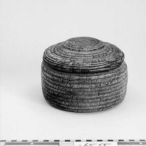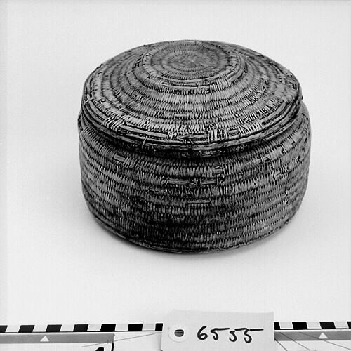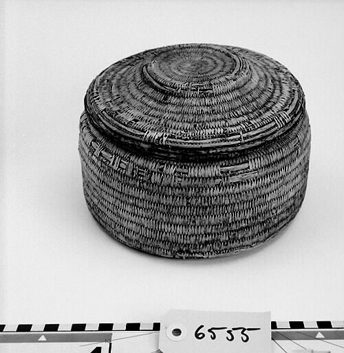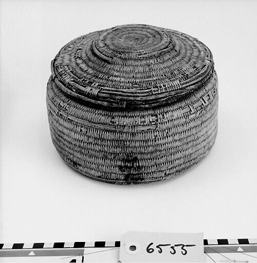 Rund, cylindrisk form med platt botten. Locket med platt upphöjning i mitten. Ljus färg.; Bindteknik med kluvna rötter. ; Rotbindning: För att binda rot behöver man grövre stödtågor och tunnare bindtågor, som dessutom kan vara delade. Stödtågorna kan vara dubbelt så grova som bindtågorna. Stödtågorna bygger upp föremålets form. Runt stödtågorna lindas bindtågorna. Samisk rotteknik karakteriseras av att man oftast binder över två stödtågor istället för en och att man under arbetet håller föremålet med mönstersidan utåt. Bindningen är mycket tät. Man har färgat rötter och använt. Länge har man använt växtfärger, sedan kom anilinfärgerna (senare hälften av 1800-talet). Då man binder med färgade rötter låter man den tåga som inte används löpa tillsammans med stödtågan. Då göms den och finns på rätt ställe när den senare behövs. Granens rötter tål mycket väta. Av granrötter blir det starka rep och telnar till nät och not. Av björkens rötter gjordes fina föremål som lämpade sig väl till mathantering, då björk inte lämnar någon smak. Innan rötterna används skrapas barken bort. Roten måste alltid mjukas upp i vatten innan man kan arbeta med den och ska vara fuktig när man arbetar med den. När den torkar blir den hård och går inte att böja utan att bryta. Under självhushållningens dagar tillverkade hushållen själva sina föremål för hemmabruk. Idag är rotslöjd främst ett exklusivt hantverk, ett konsthantverk. Källa: Dájvve – om rot och hantverk och redskap/ruohttsasa giehtaduojen ja nävon. Ájtte 1995. Parallelltext på svenska och lulesamiska. Läs mer om samisk rotslöjd i ”Asa Kitok och hennes döttrar” av Tom G Svensson.