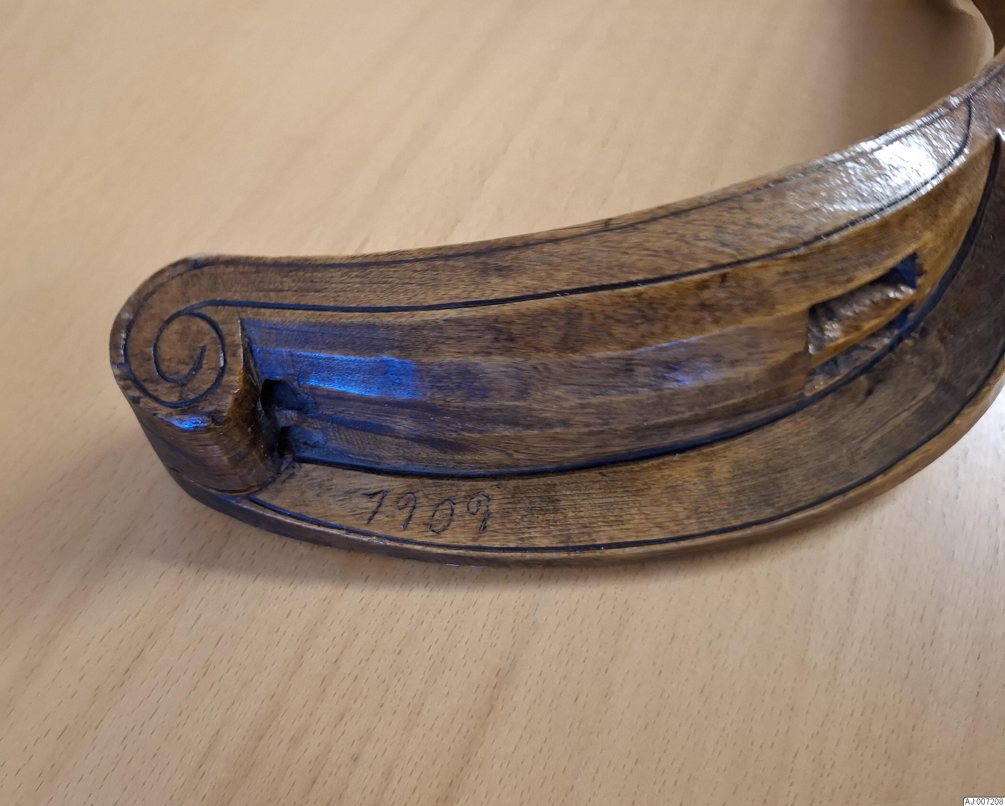 AJ 7208:1 ena lokan. I lokan är årtalet 1909 samt en blomma inristad. I nederänden sitter en metallnit, kanske för att låsa remmen under magen.