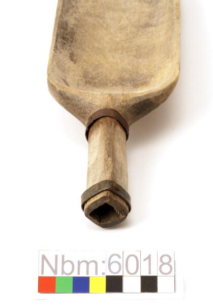 Löst skovelblad att fästa på spjutspets. Skaftet ihåligt och omvirat med ett järnband och mässingplåt. Bladet försett med ett hål.