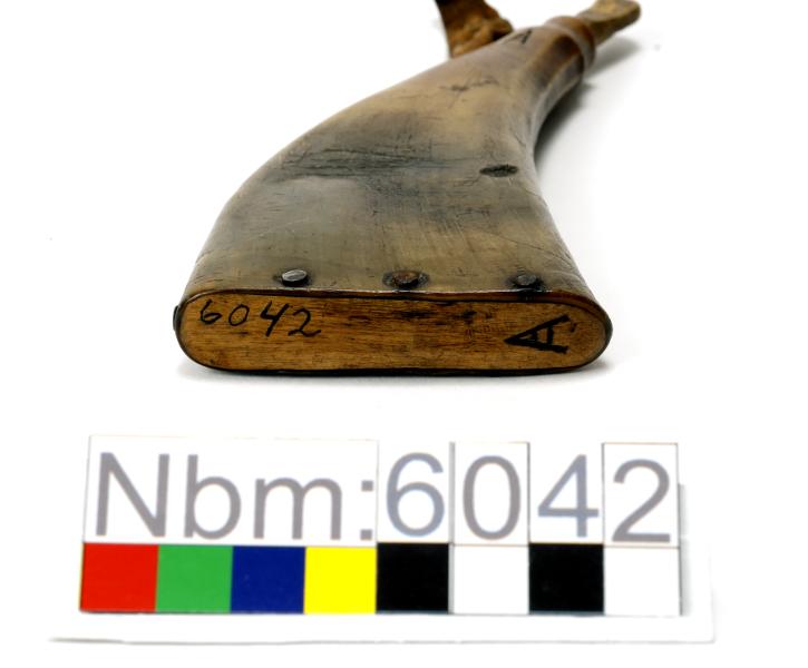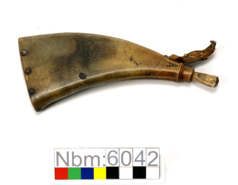 Hornet med bottenplatta i trä, samt träplugg för öppningen. Rester av skinnrem. Bomärke A (se skiss).