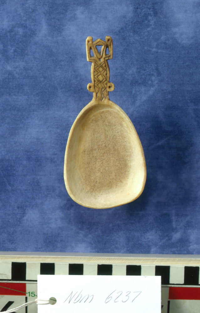 - Päronformat blad med skaft. Genombrutet, profilerat, sick-sack-graverat skaft. Överst på skaftet är tre trekanter utskurna så ett V bildas i hornet, samt en kvadratisk form. Nära bladet är en ring utskuren på vardera sidan av handtaget. Handtag Gu/L 4,1 cm.