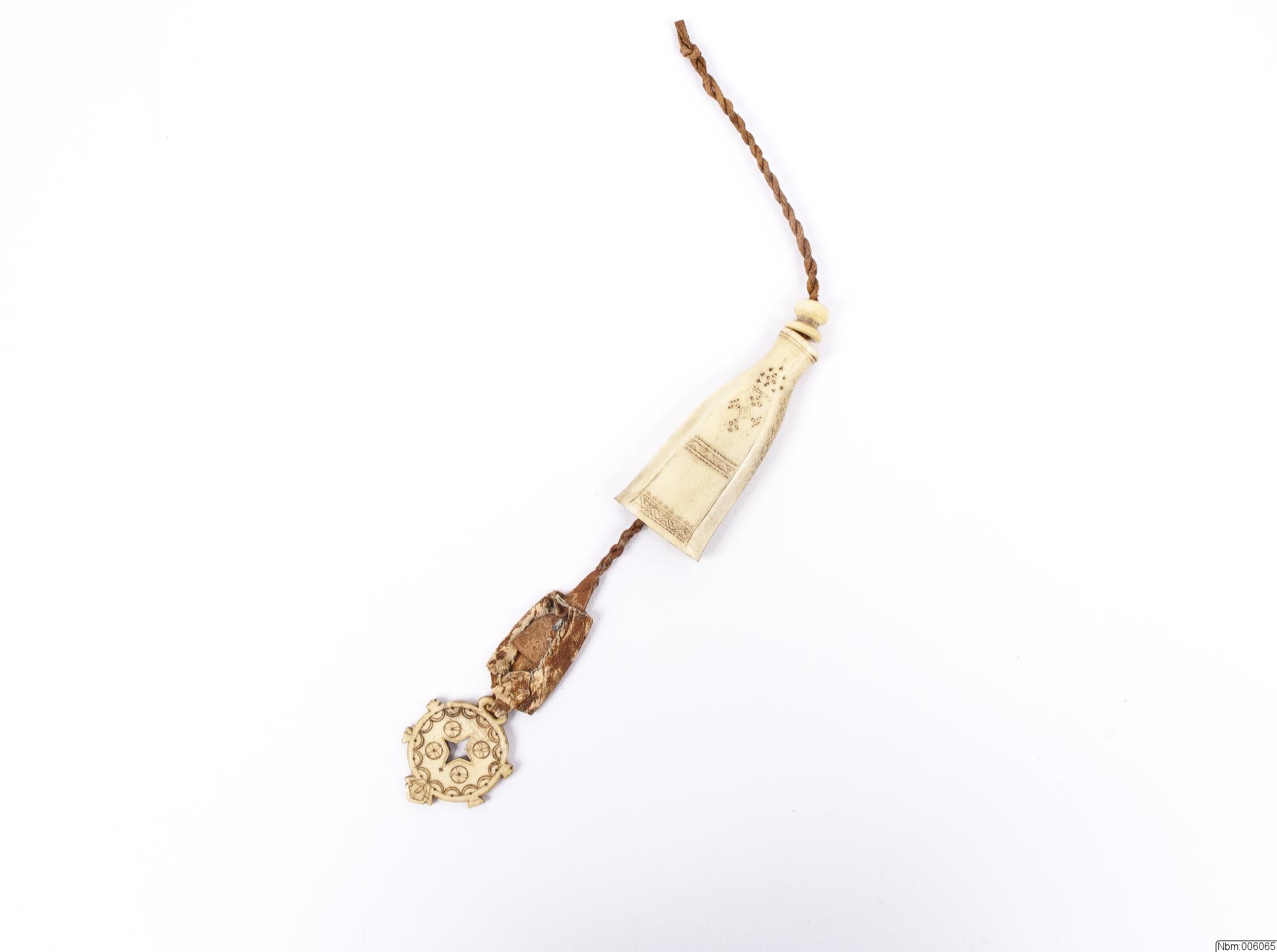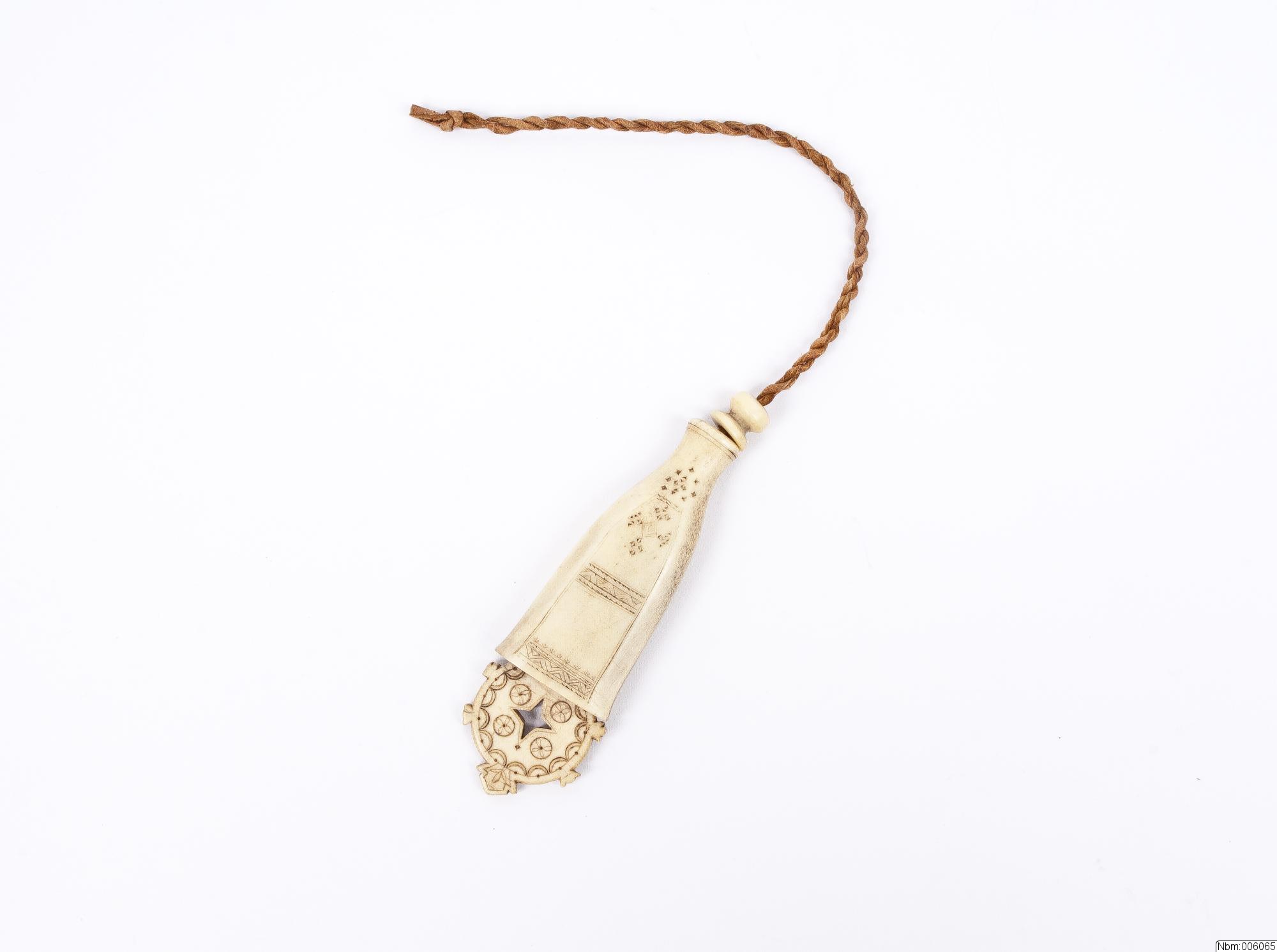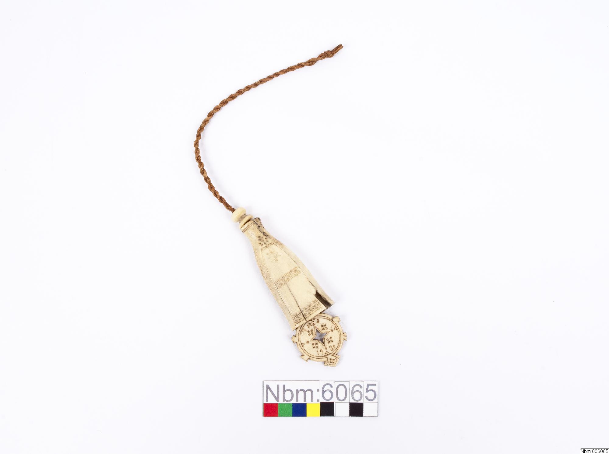 Nålhus av horn. Uddsticksmönster på båda sidor. Upptill en hornpropp som glider på skinnsnodd. Nertill en hornplatta med ornament, inristat på plattan: 22.8 1930.