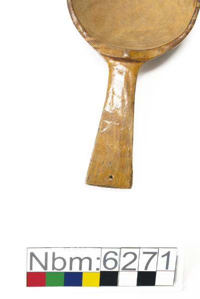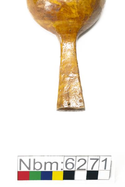 Rund form, relativt låg med skaft. Fernissad på utsidan.