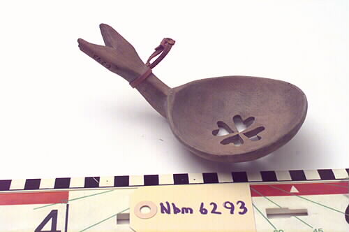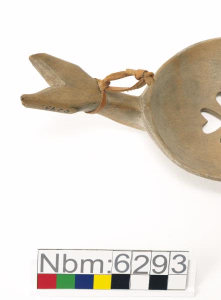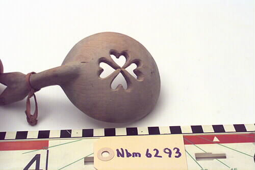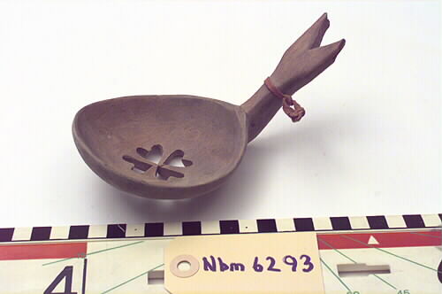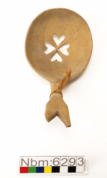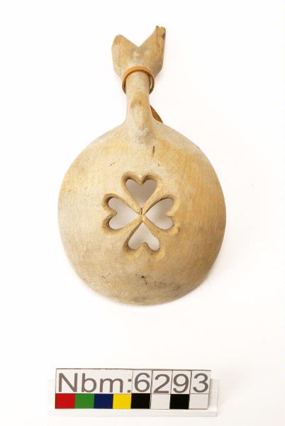 Rund form relativt platt. Fyra hjärtformade urtag i botten. Skaftet skadat.