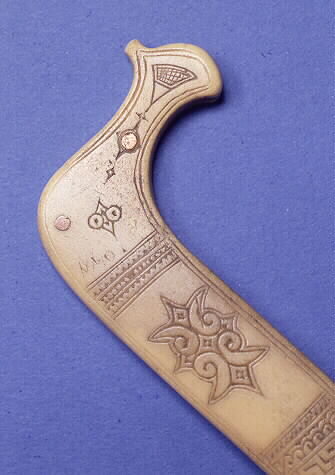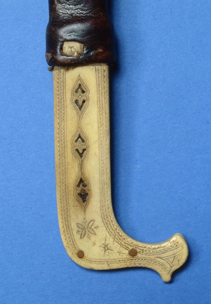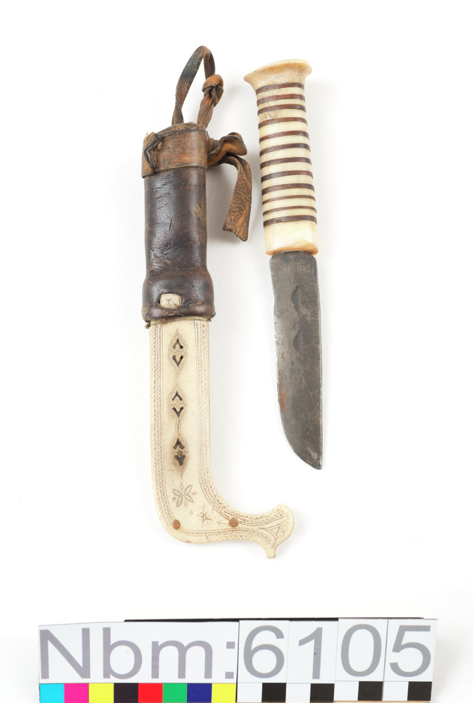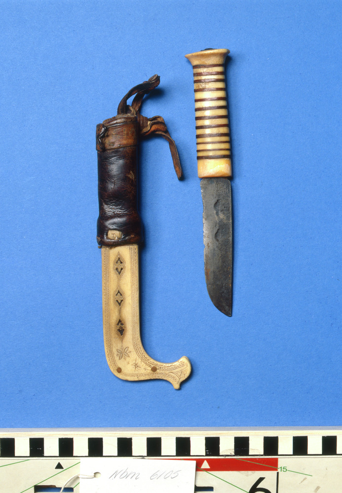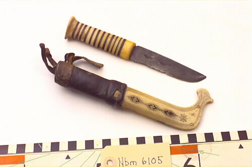 Knivskaftet av horn med näver som mellanlägg, så det ser "randigt" ut. Knivblad av stål. Slida av renhorn med överdel av skinn. Överst på horndelen är en knopp av horn, där har läderholken ett hål. Det gör att den sitter fast i slidan. Slidan med nordsamiska ornament på fram- och baksidan. Genombrutna ornament på framsidan. Tvärböj längst ned på slidan. Otydligt inristat på baksidan: NMO. Överst på slidan är en skinnrem fastknuten runt läderholken, som upphängningsrem. Kniv L 18,7 cm slida 19,5 cm.