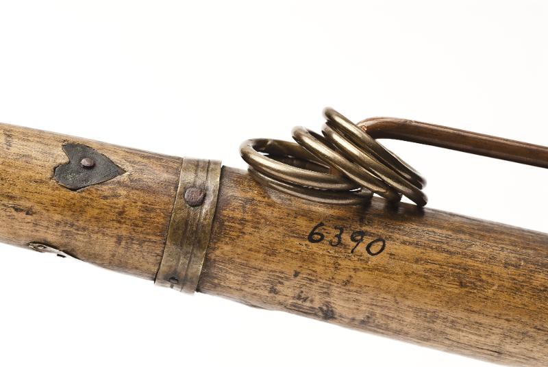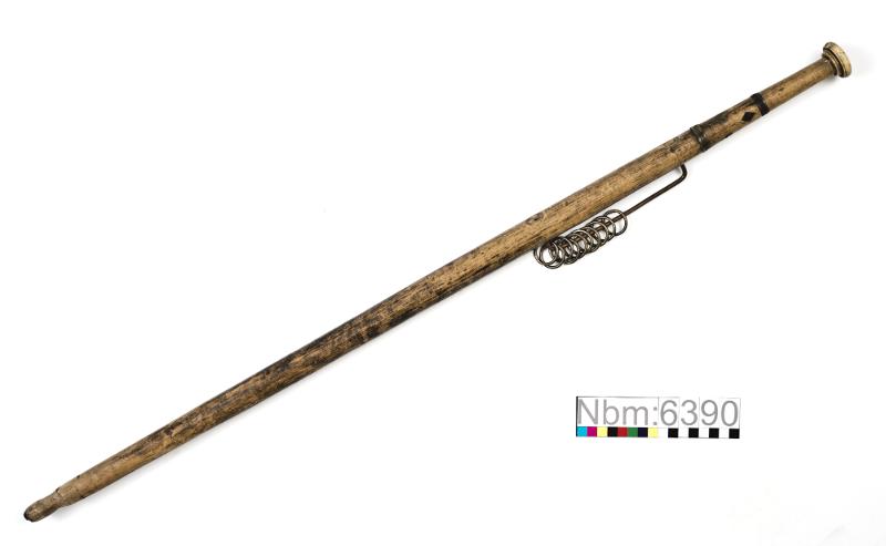 Körstav som användes vid körning med ren och ackja. Av trä med hornknopp. Kopparhandtag på mitten med påsatta mässingsringar. Infällt av mässingsplåt hjärtfigurer och romboida ss dekor.
