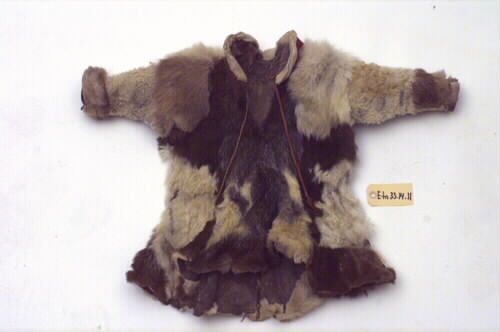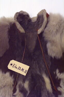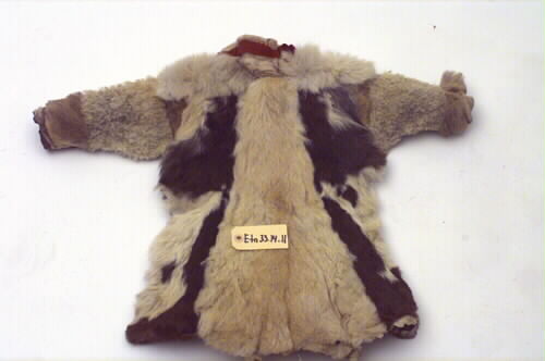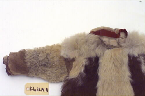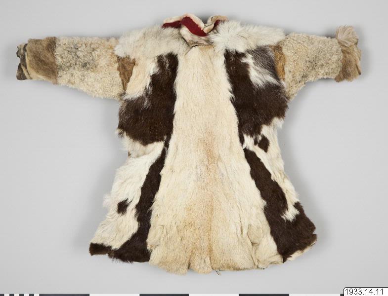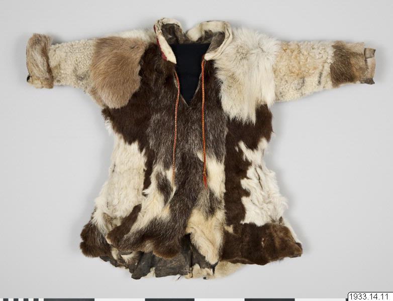 Anm: Ny katalogisering: Material: Killingskinn, får-/lammskinn, renskinn, skinn från bälling /gámas (pälsskinnen på benen) av ren, sentråd/suotna , ulltyg/kläde/láddi , ullgarn/láigi. Ryggpartiet sydd i tre våder av killingskinn. Skarv av renskinn i anslutning till högra ärmdel. Frampartiet sydd i tre våder av killingskinn . Skarv av renskinn i anslutning till höger ärmdel. Skarv av renskinn längst ner på vänstersidans våd.