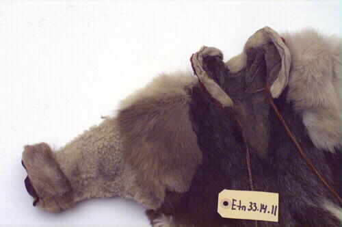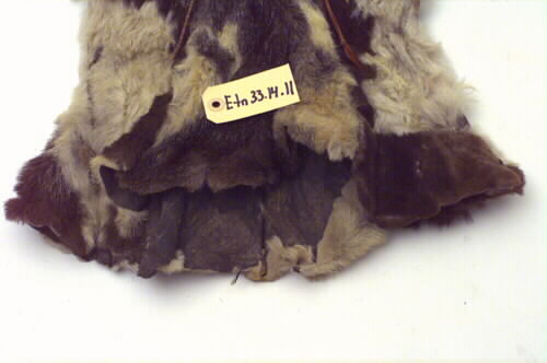 Av ren- och lammskinn; delvis bellingar. Röd klädesgarnering vid kragen. Glipbanden flätade av rött och gult garn. Pälsens färg övervägande vit och brun.