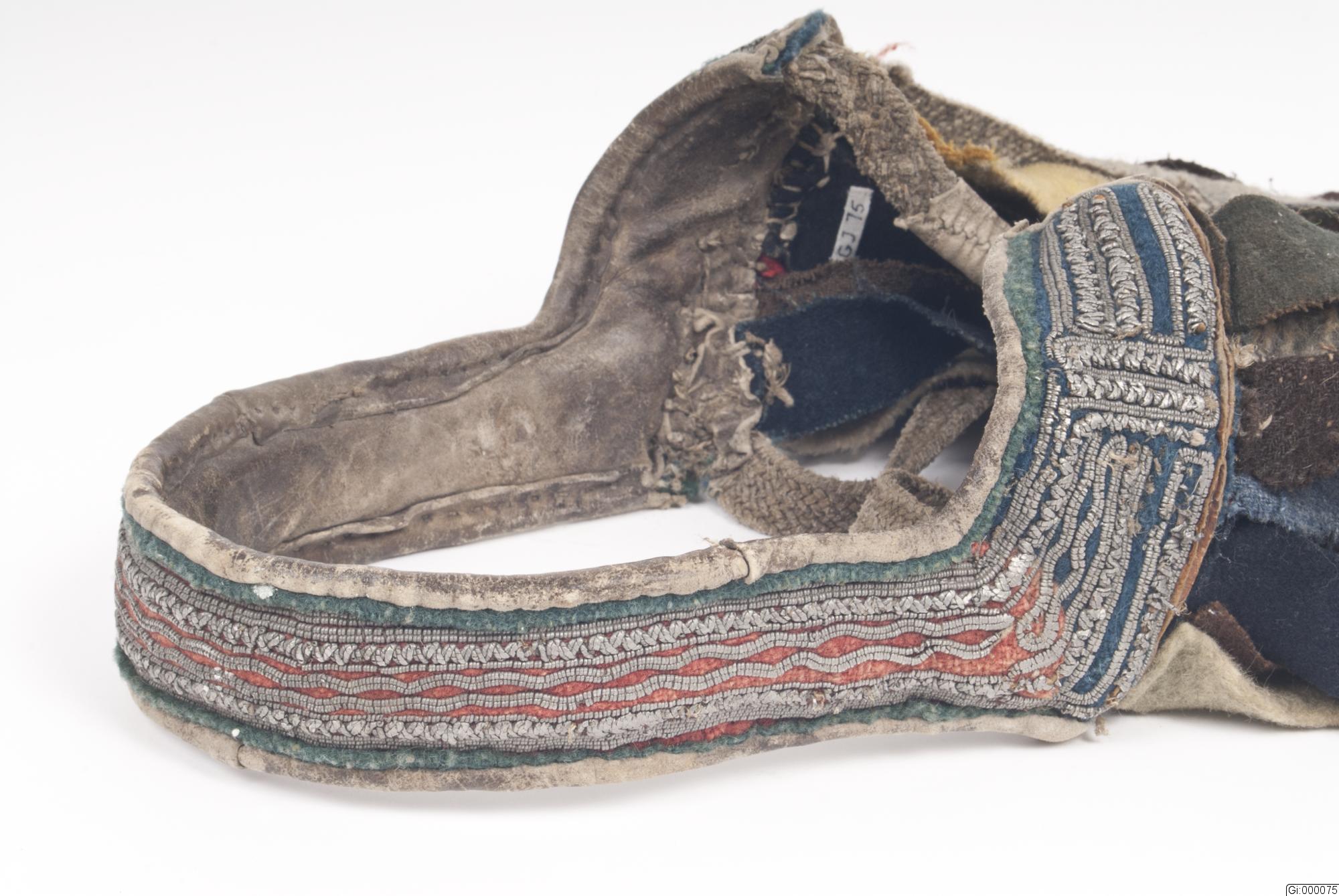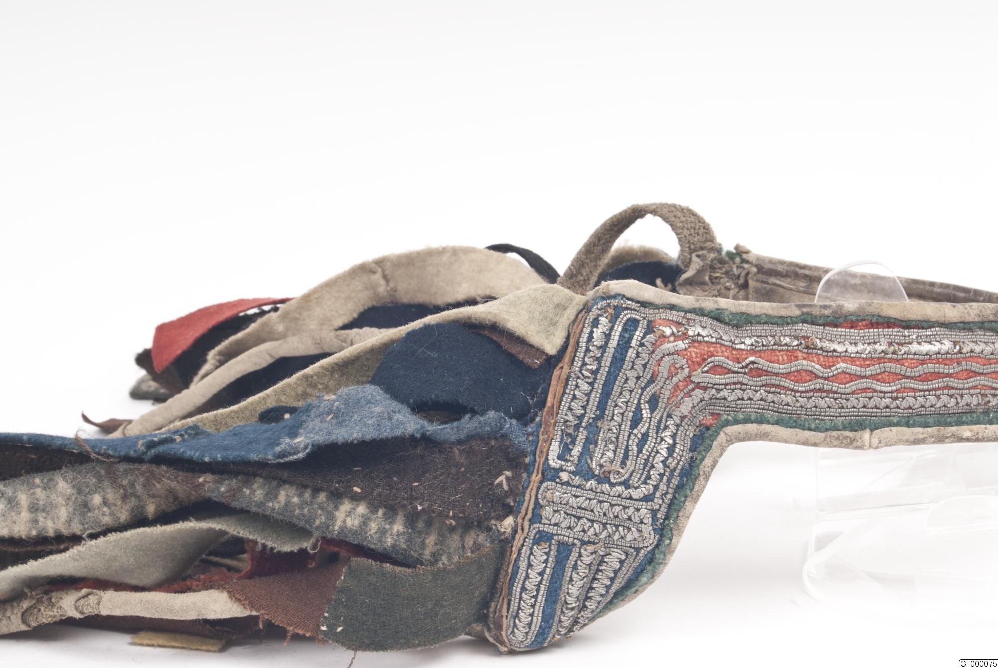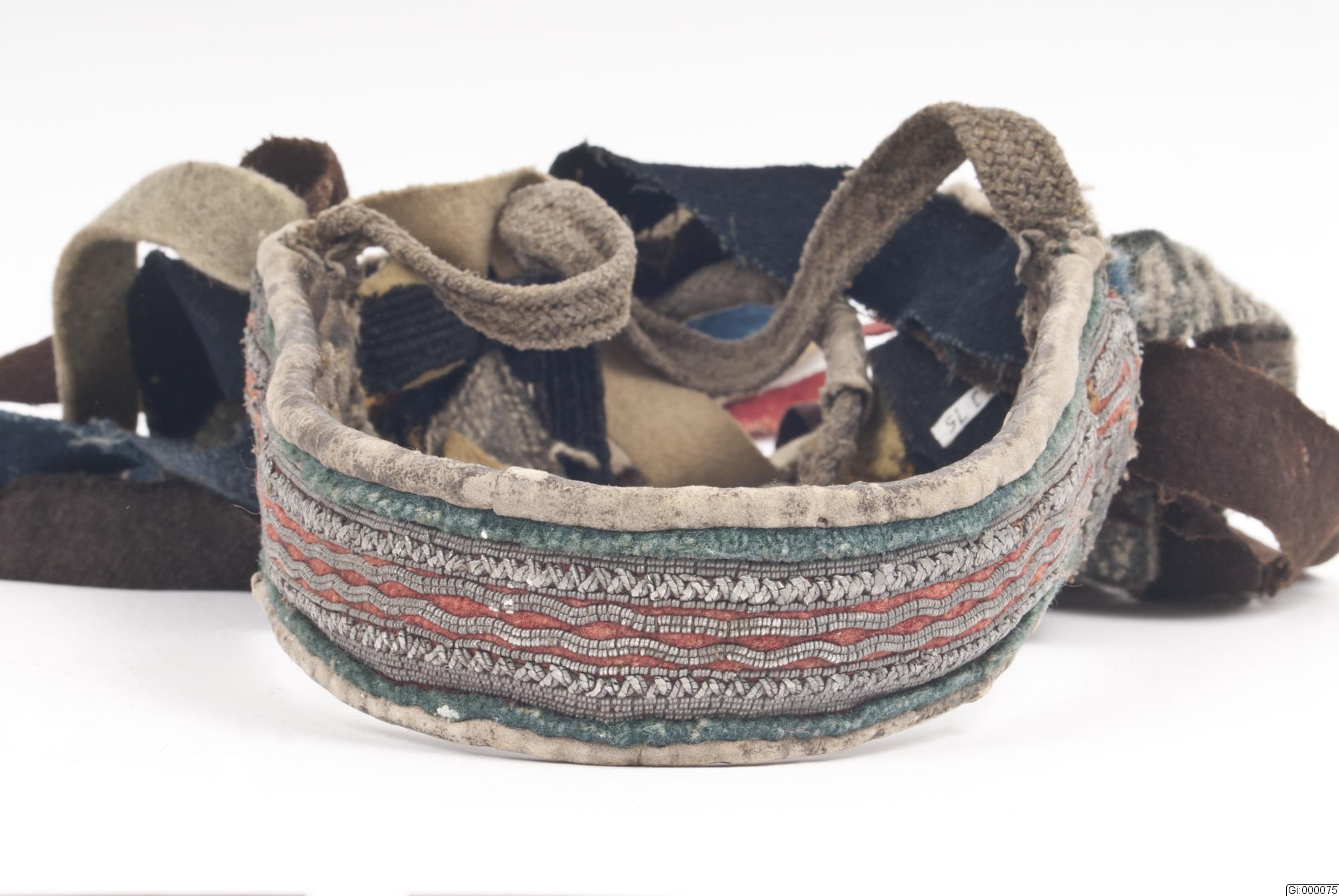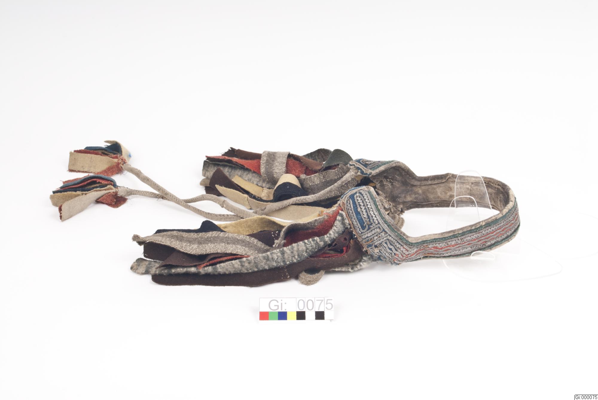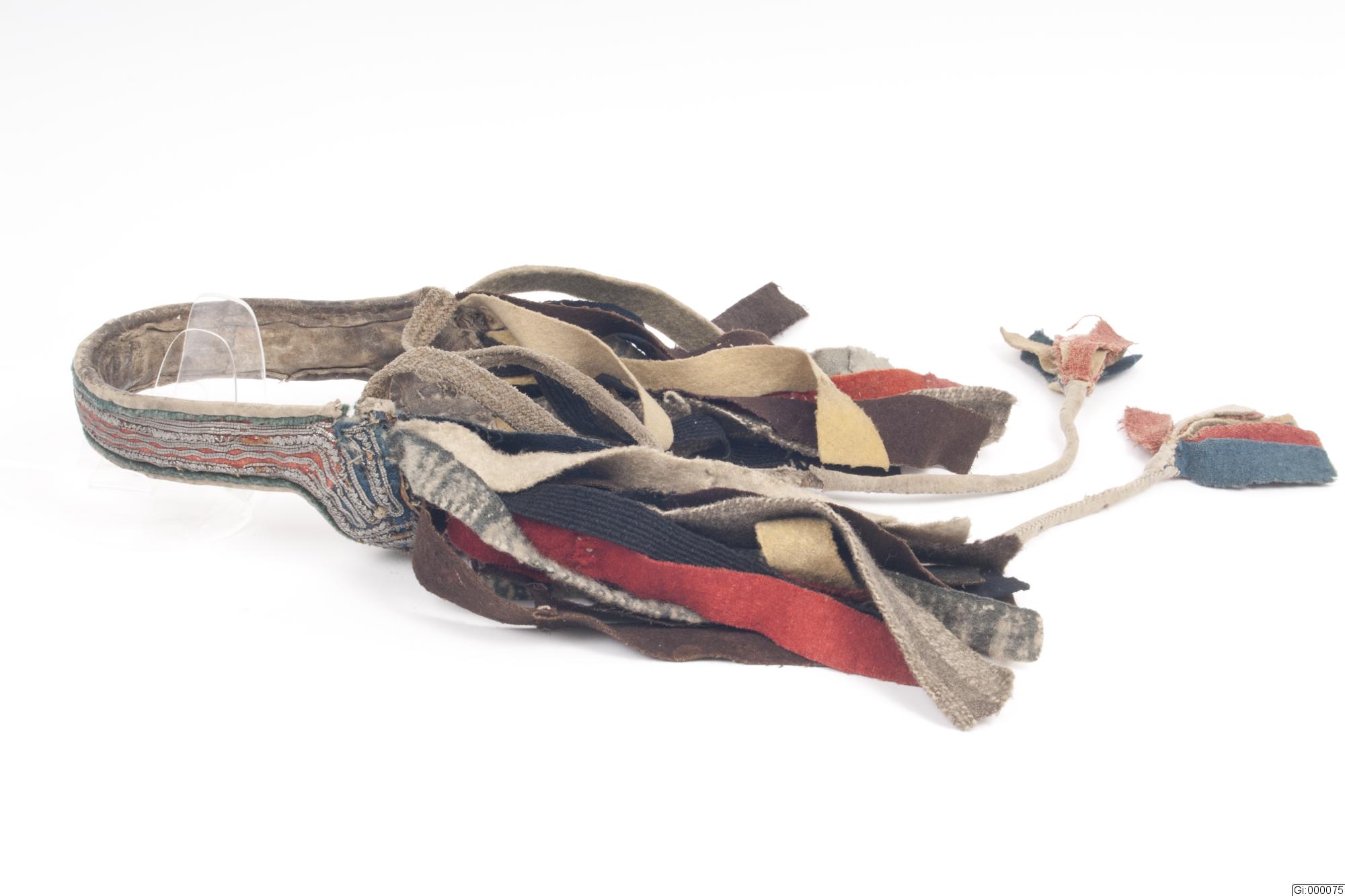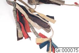 Tennbroderad med ca. 3 dm långa 2 cm breda fransar av ylle och två tofsar på skinnklädda snören.