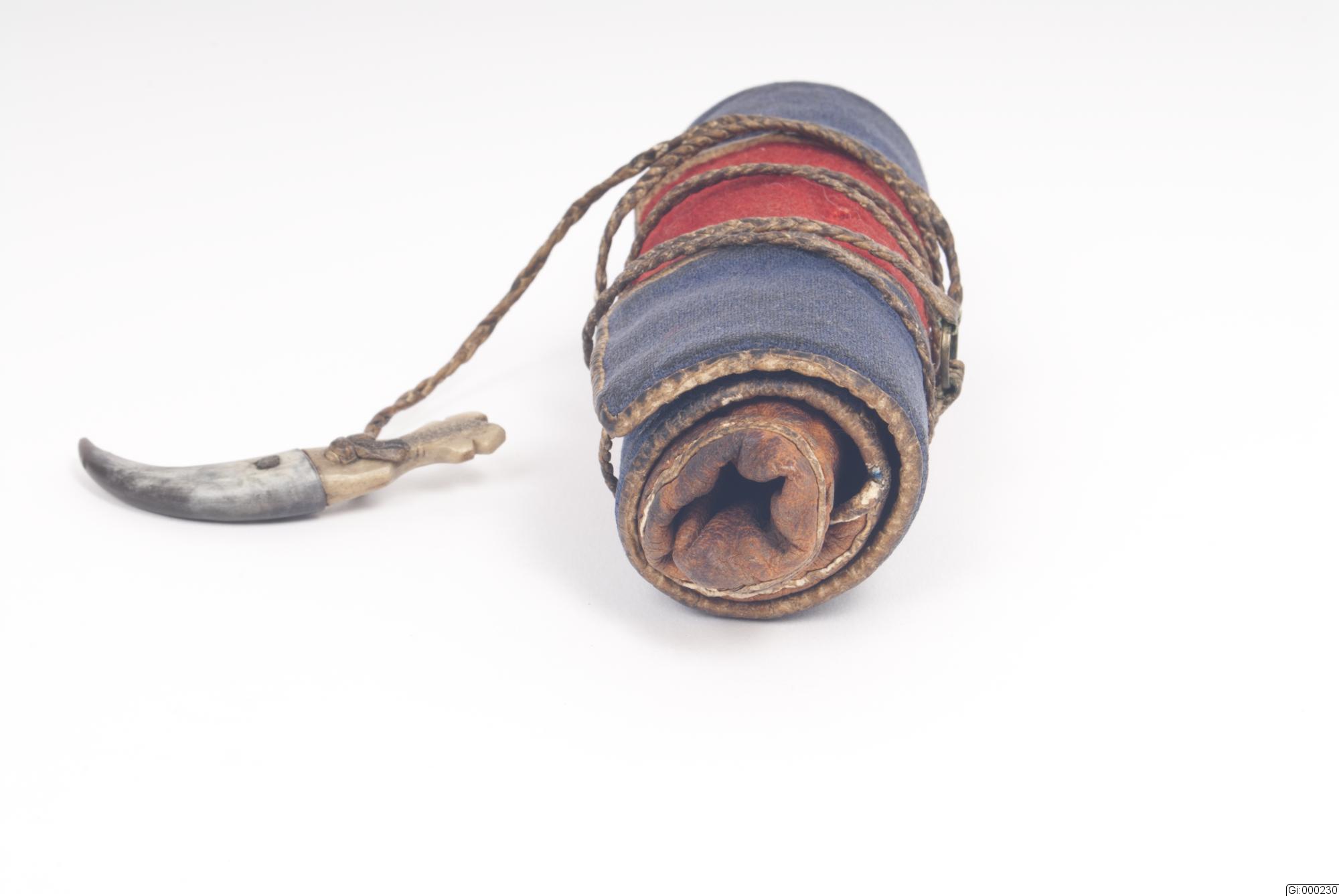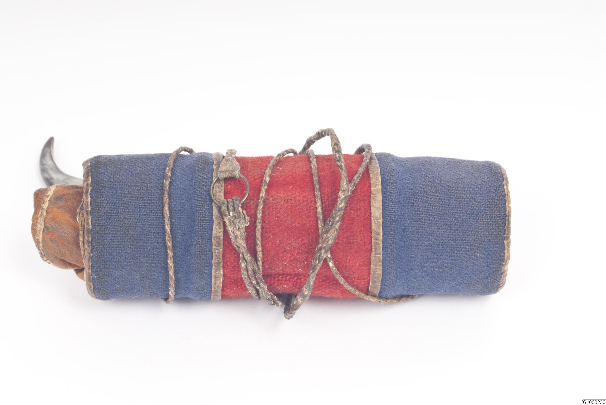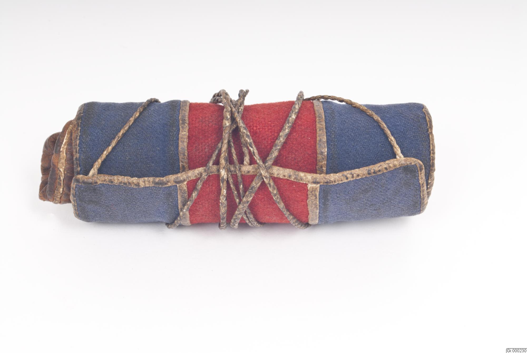 Av skinn med stort lock att rulla ihop kring själva pungen. Med snören och ränsningspigg av skinn och örnklo. Lockets yttersida av rött och blått ylletyg.