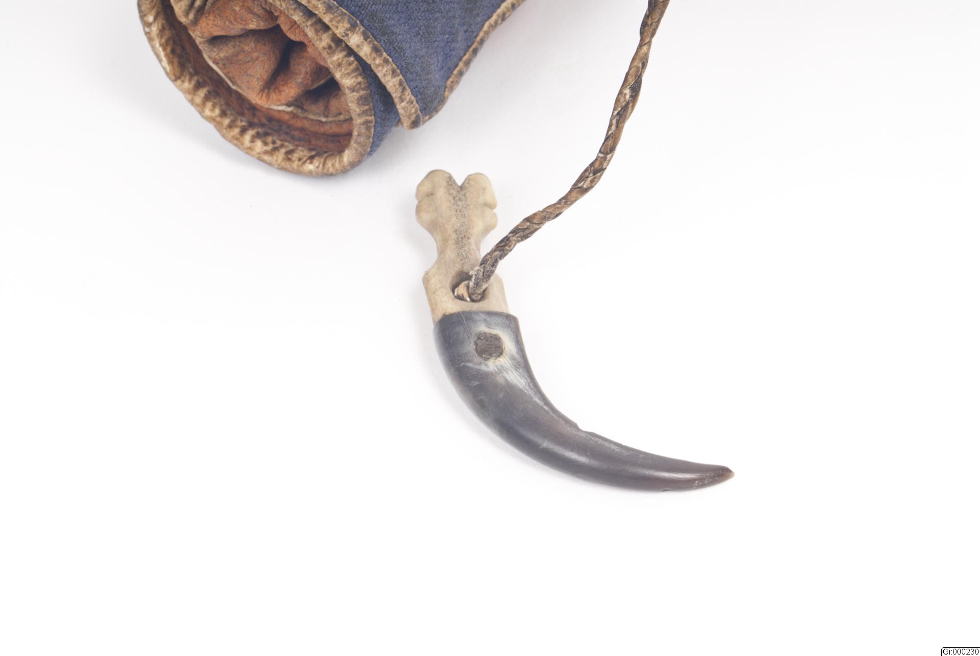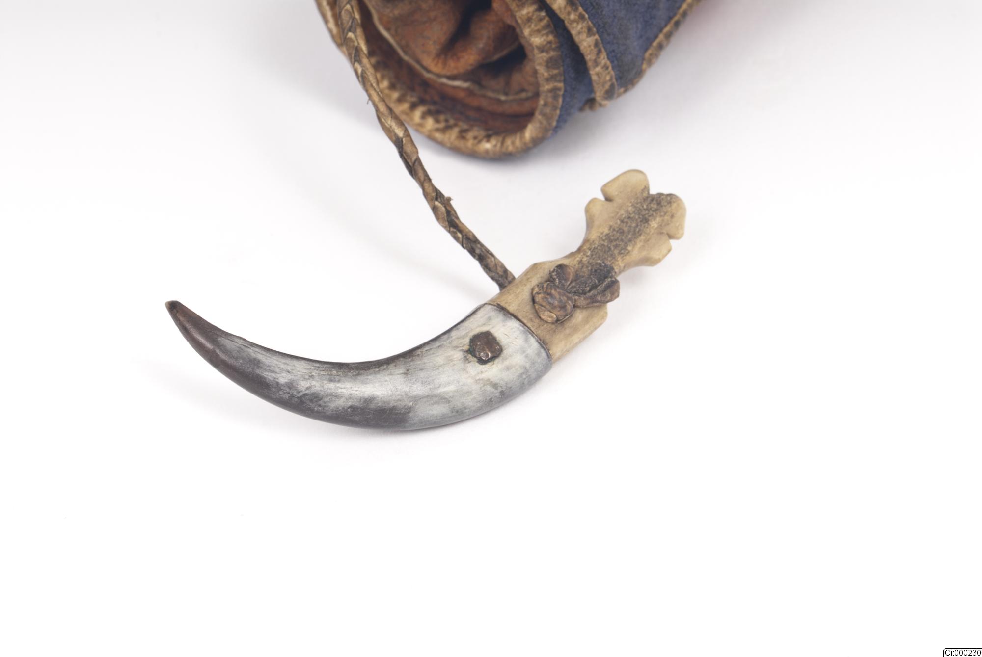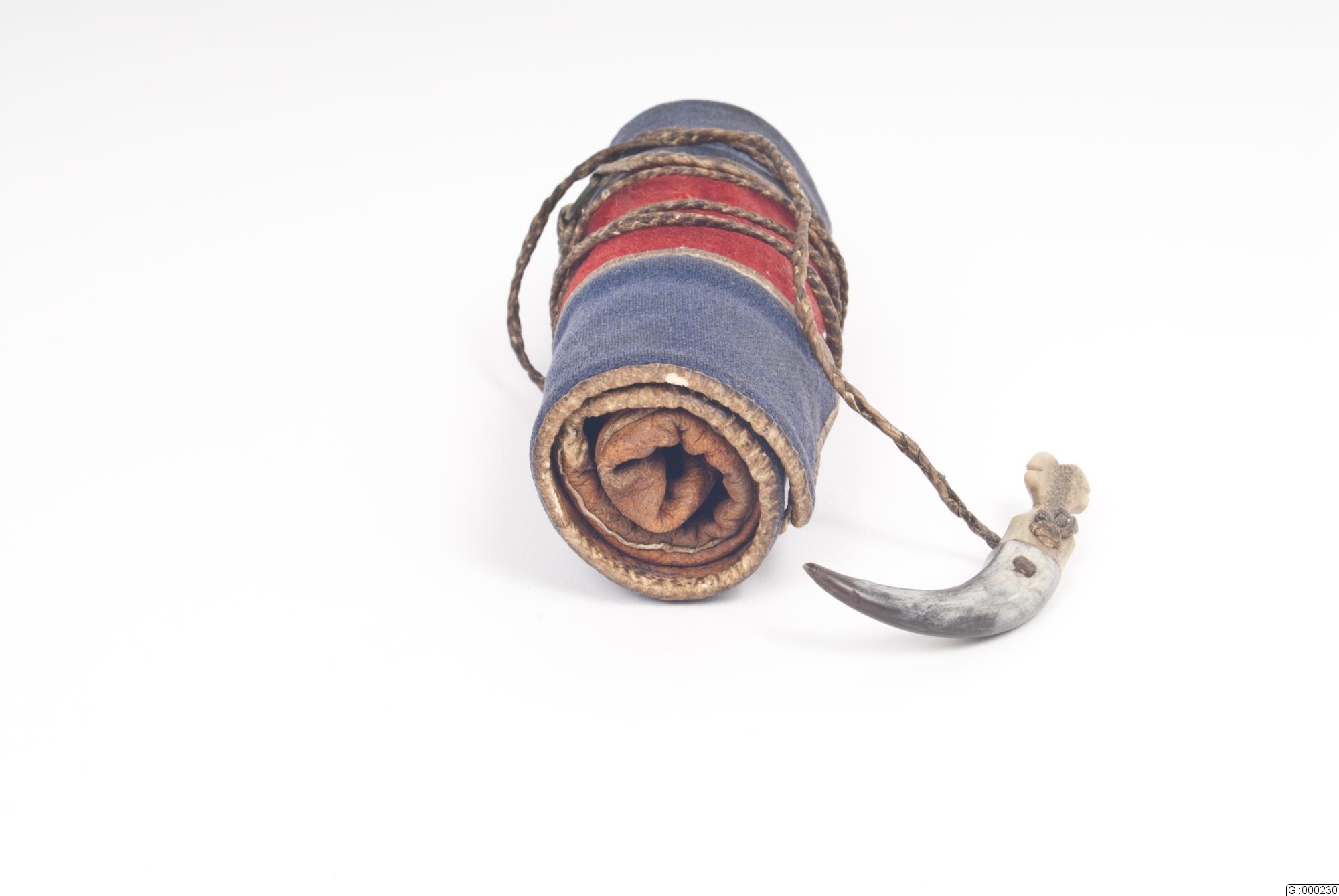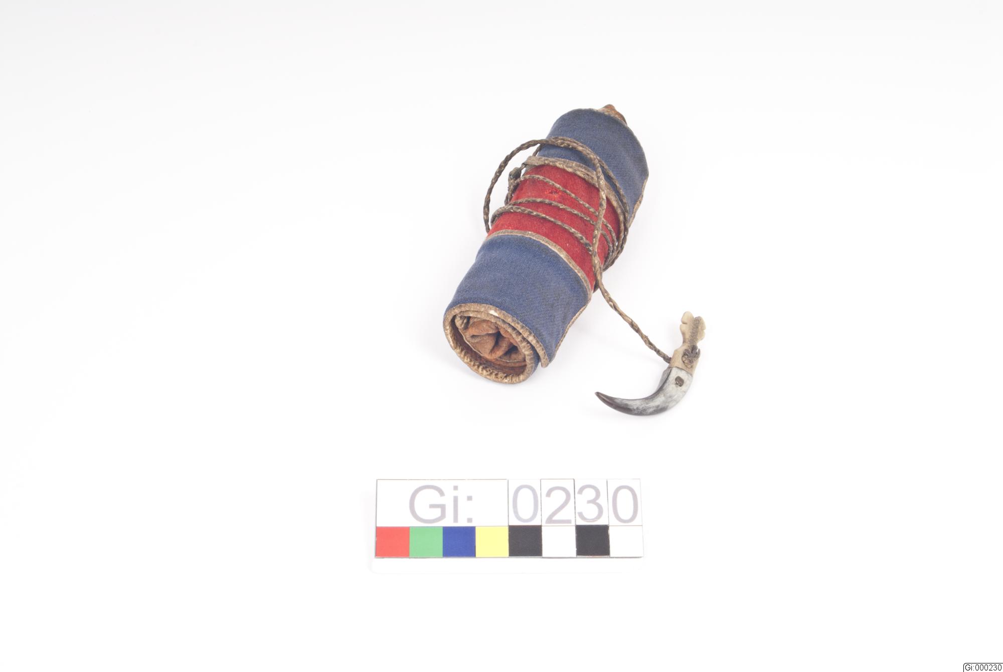 Av skinn med stort lock att rulla ihop kring själva pungen. Med snören och ränsningspigg av skinn och örnklo. Lockets yttersida av rött och blått ylletyg.