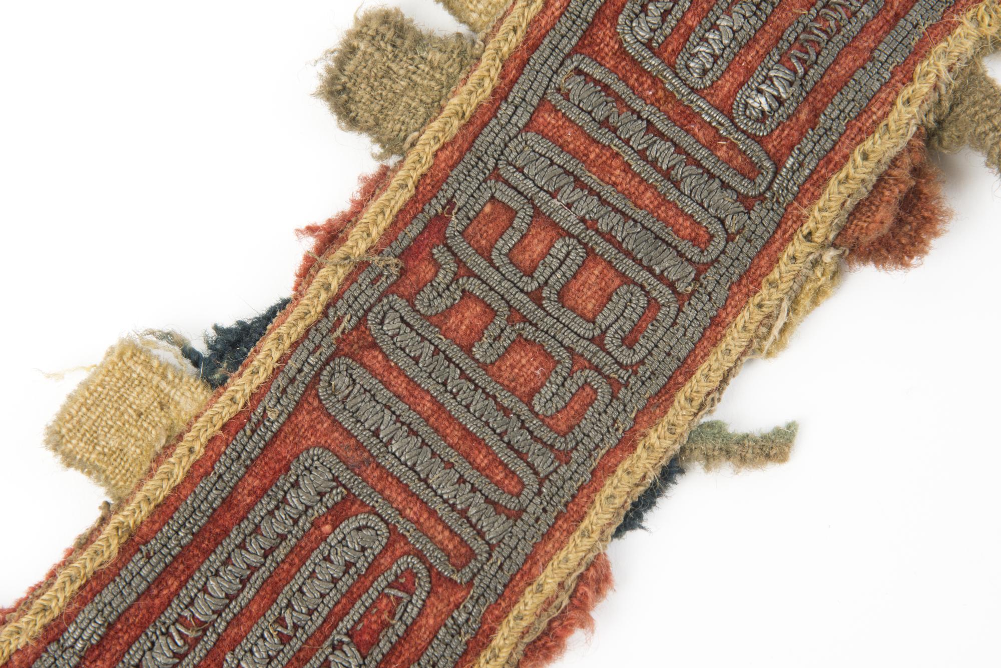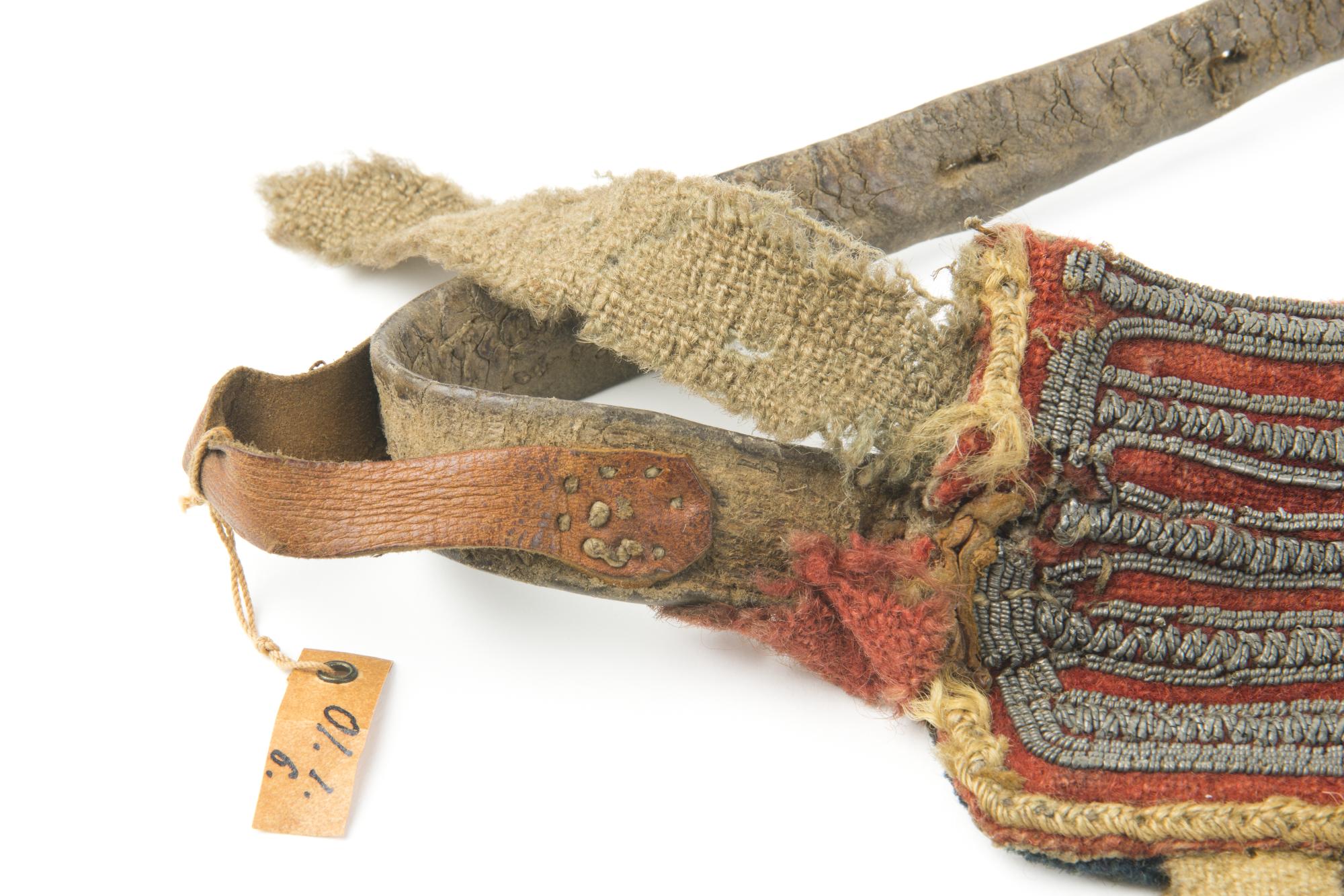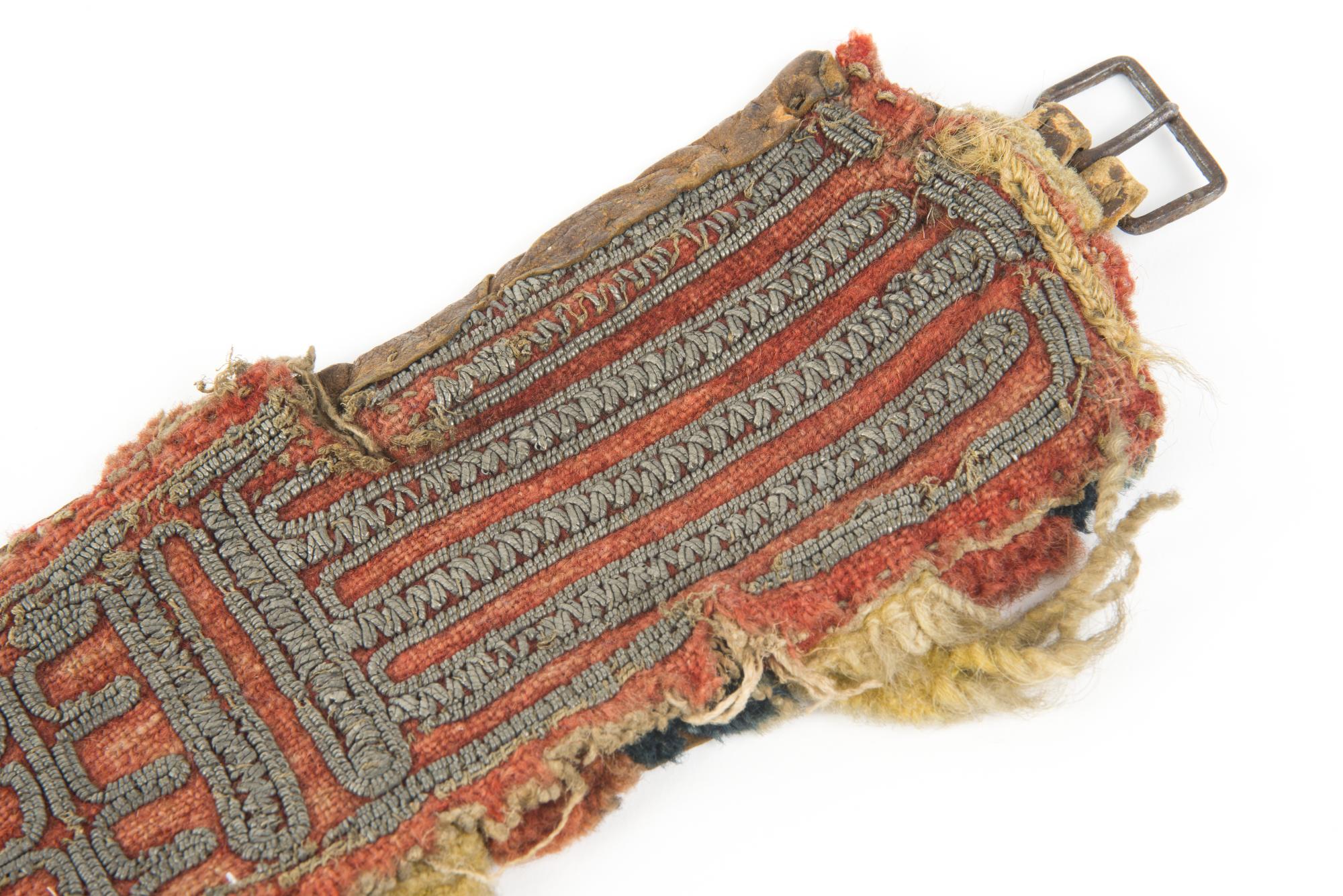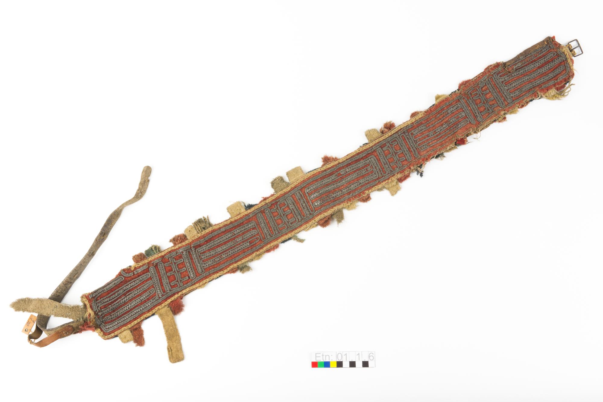 Ryggrem till ren av skinn med kläde på ovansidan. Rikliga tennbroderier på klädet. Längs kanten är en fläta av garn och dubbelvikta tygbitar fastsydda som dekoration.