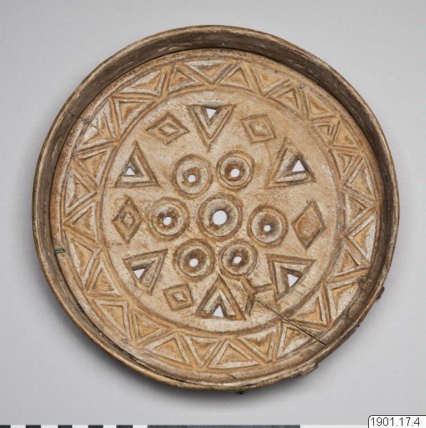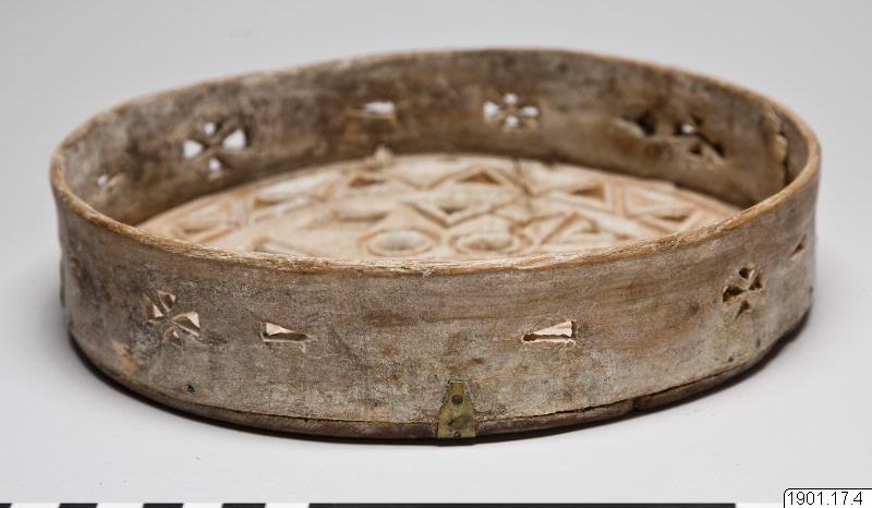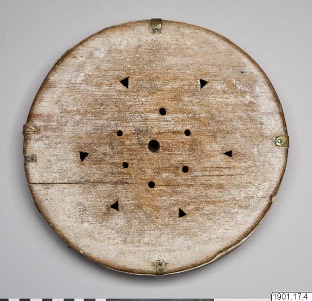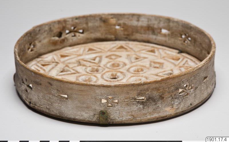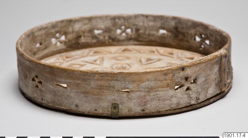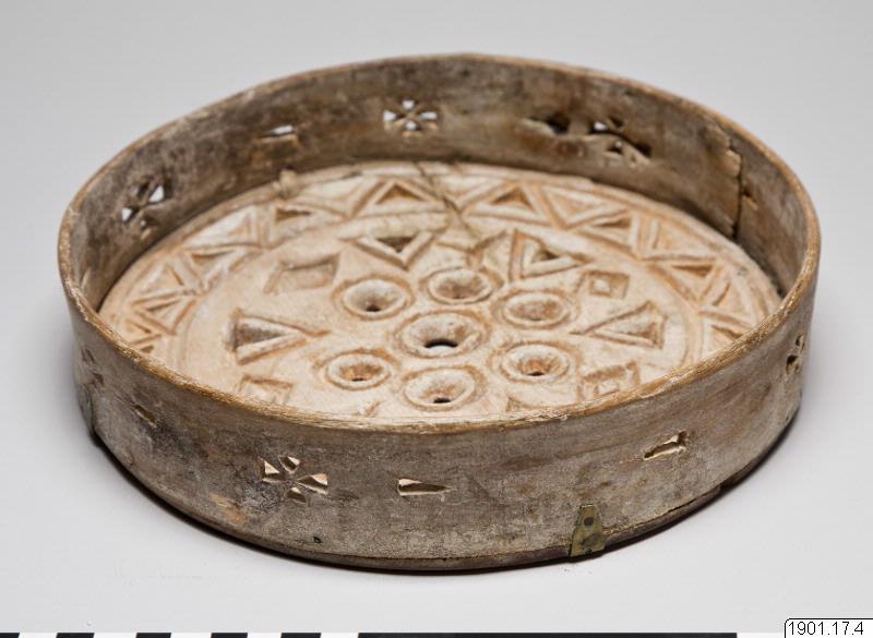 - Ostformen består av en rund hel bottenplatta med snidat hålmönster. Kanten är svept trä fäst med hornplatta som spilats/nitats fast med kopparspik. De bägge delarna sitter ihop med dels rottåga samt mässingsplattor.