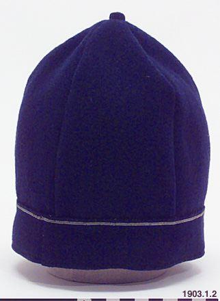 Mössa, för man, sydd av blå vadmal. 5 kilar sydda med maskin.