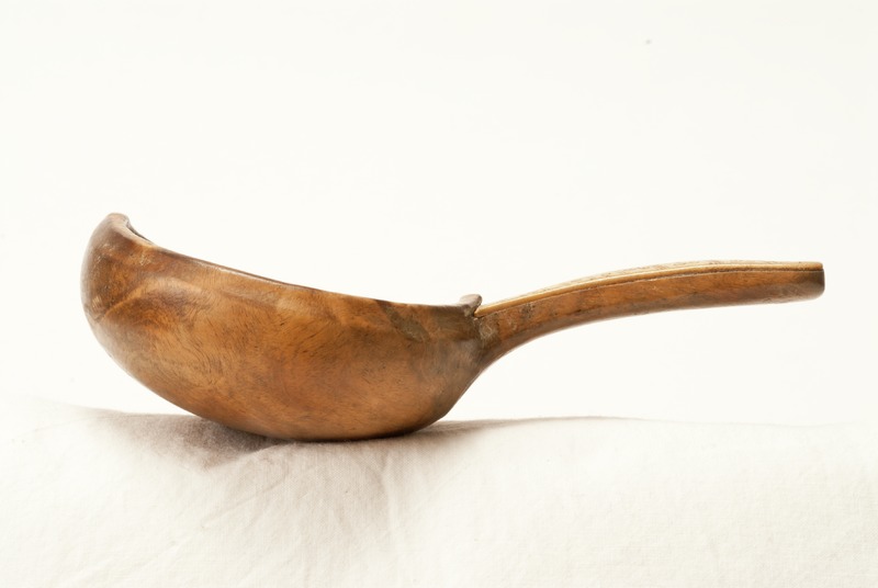 - Låg, vid träkosa. På ovandelen på skaftet är en ornamenterad hornplatta fastnitad. Skaftet är ihåligt och fyllt med något som skramlar. Bomärke finns på skaftets undersida. Svagt fasad kant nedanför kosans nederkant.
