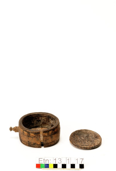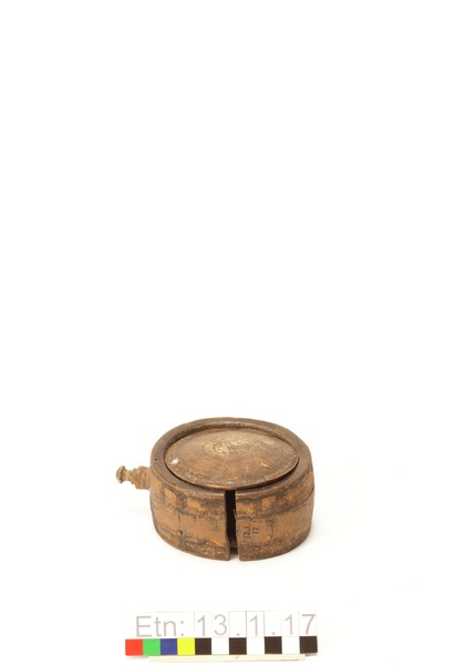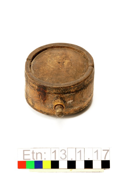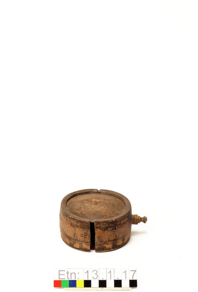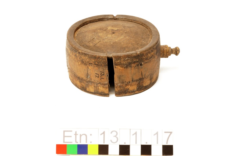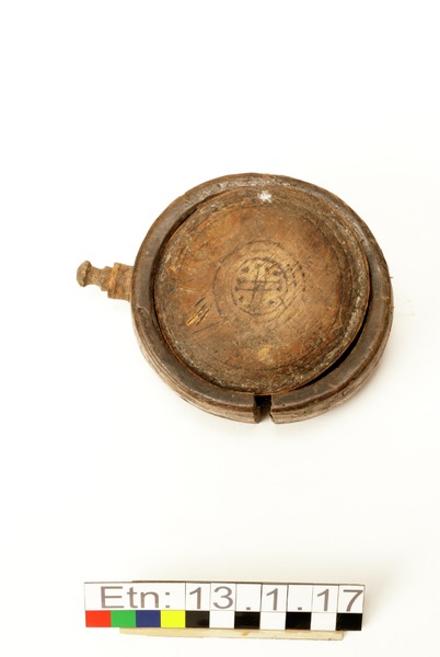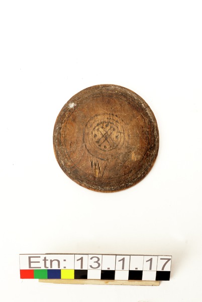 Brännvinsplunta av trä. Ena sidan märkt med ett H, den andra enkelt ornamenterad med cirklar och streck.