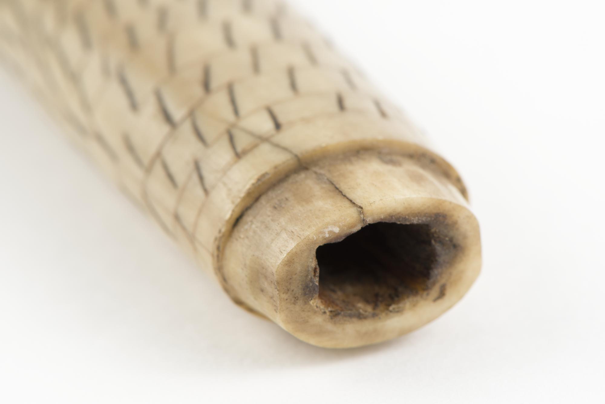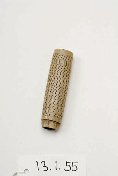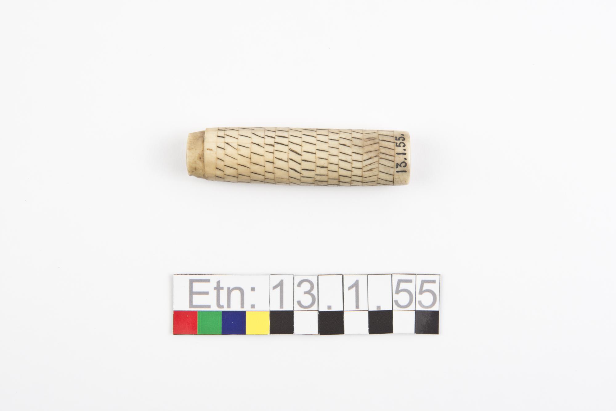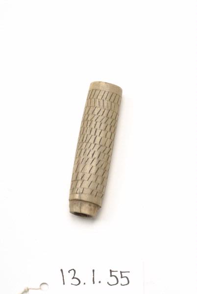 Knivskaft, dess hela yta prydd med korta långstreck, skilda genom parallella linjer, löpande runt skaftet.
