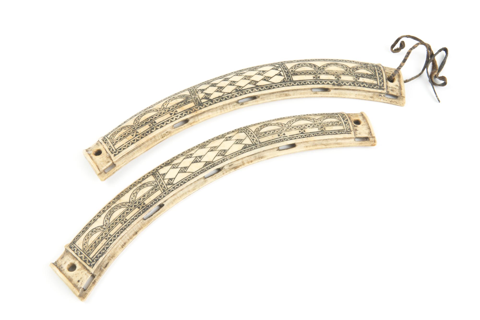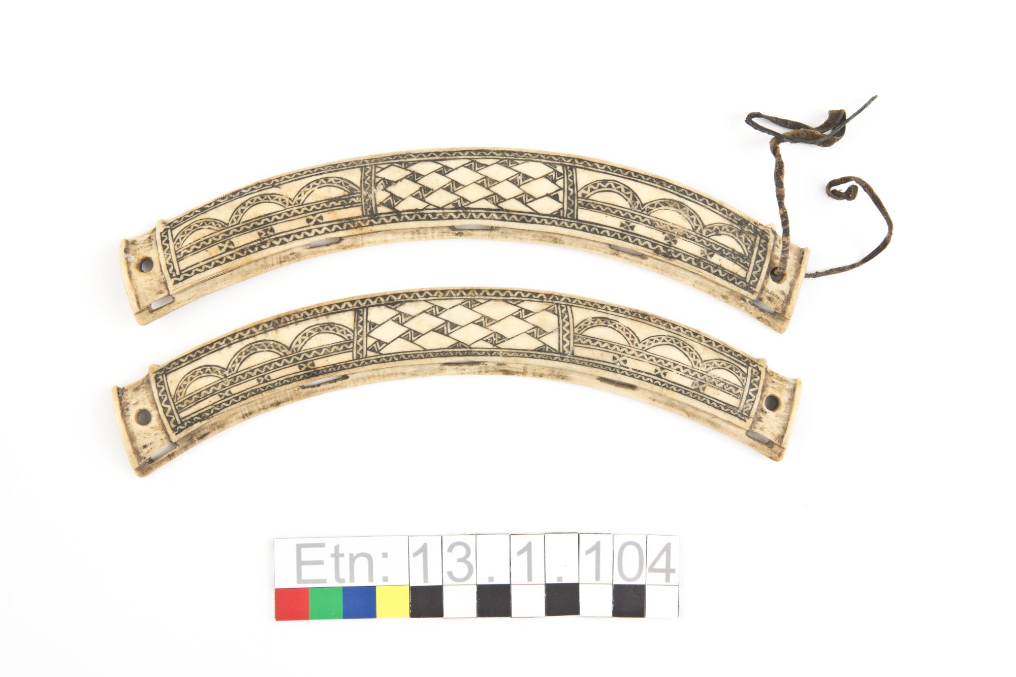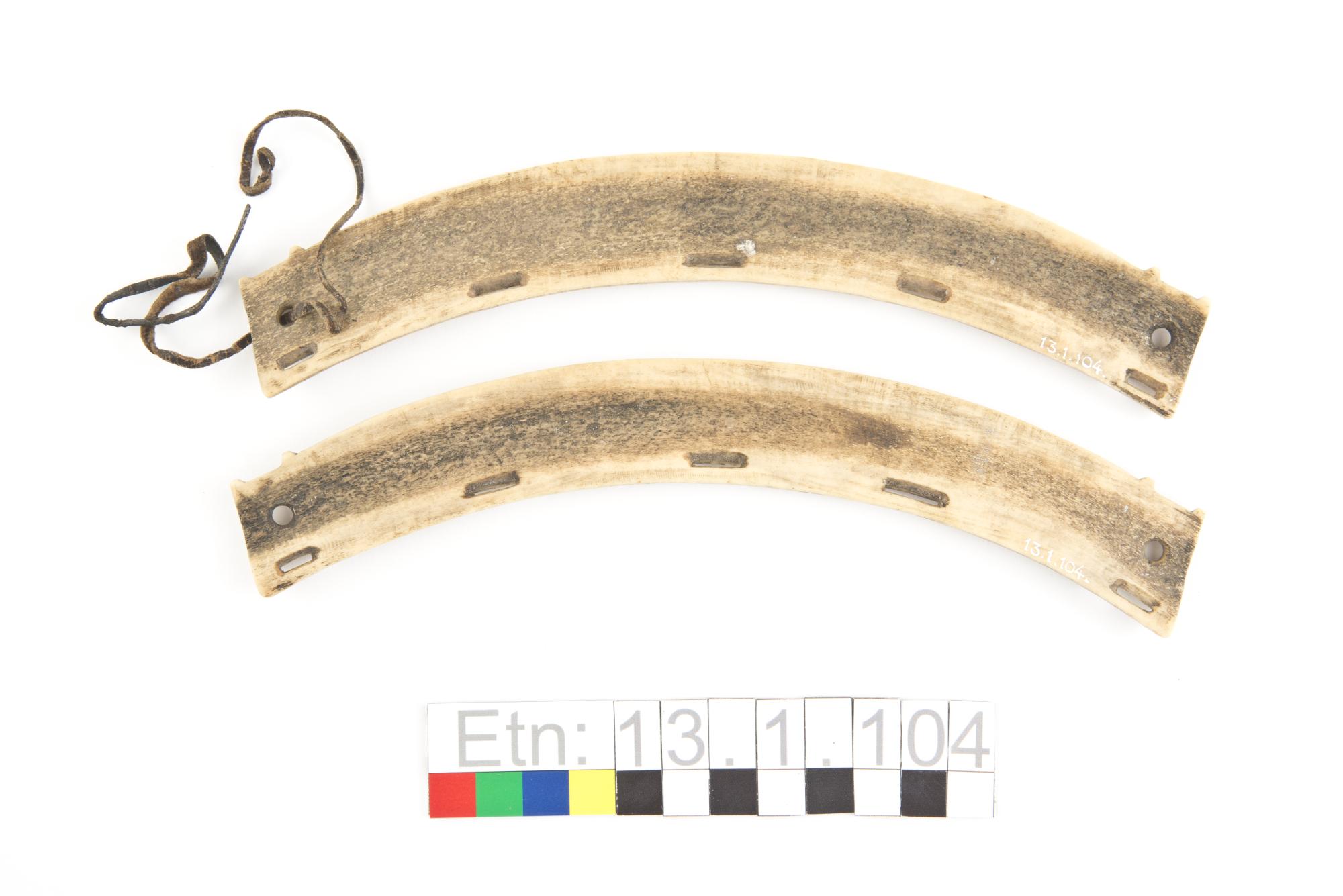 Skivor av renhorn, bågformiga; 1 par, vackert ornamenterade. Fästes på väskor vid dessas övre kant.
