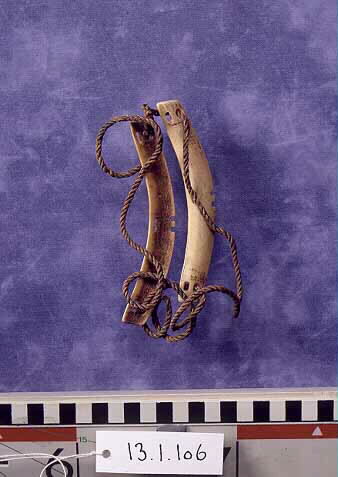 Ett par väskbyglar trädda på en tvinnad skinnrem. Graverad endast ute i ändarna. Profilera i överkanten i mitten. Tre hål att fästa säcken i. Ett hål i vardera änden som skinneremmen går igenom.
