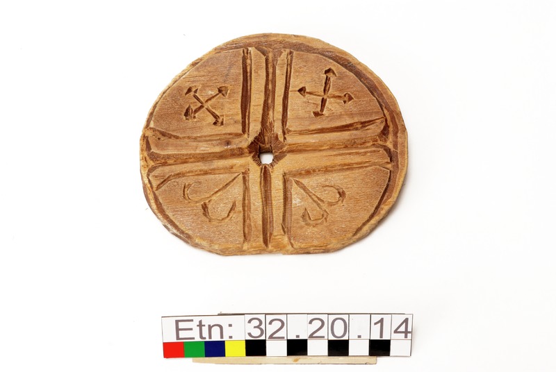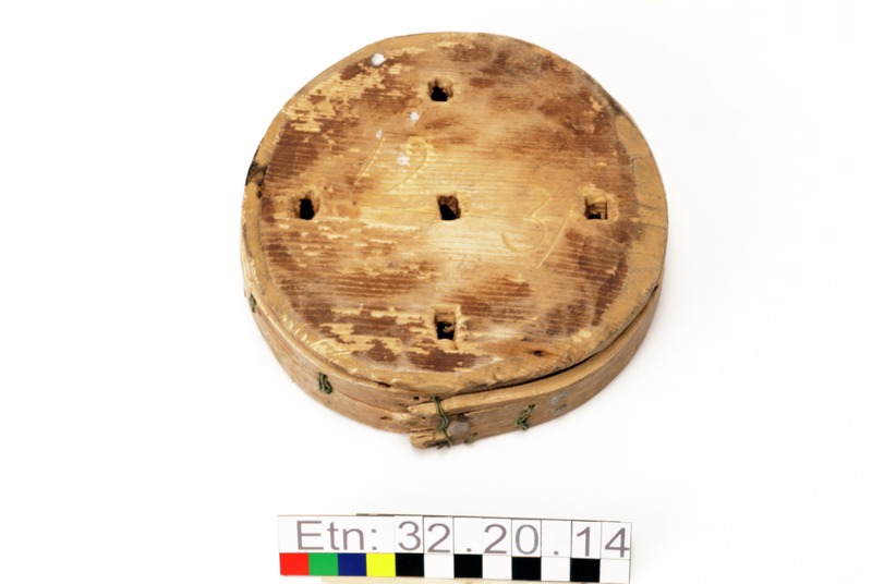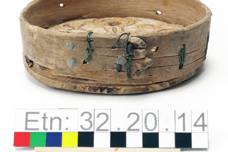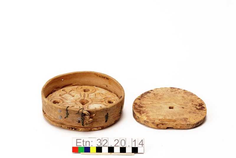 Ramen (sidan) av björk, botten och lock av gran. Skarven dels nitad med bly, dels sydd med mässingstråd. Ramen sprucken och hopsydd med mässingstråd. I bottnen 5 hål för vasslan; översidan utsirad med inskurna figurer: ett större kors med två mindre kors och initialerna N. och M. mellan armarna; på undersidan årtalet 1931. Lockets undersida utsirad med ett större kors och mindre figurer; i huvudkorsets skärningspunkt ett hål.
