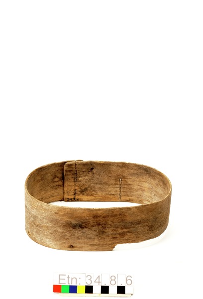 Av björk; en tunn spjäla. Svepet ovalt. Ändarna hopsydda med 2 vertikala sömmar på ena långsidan.