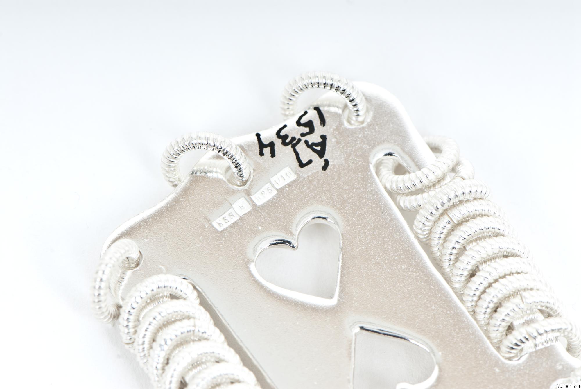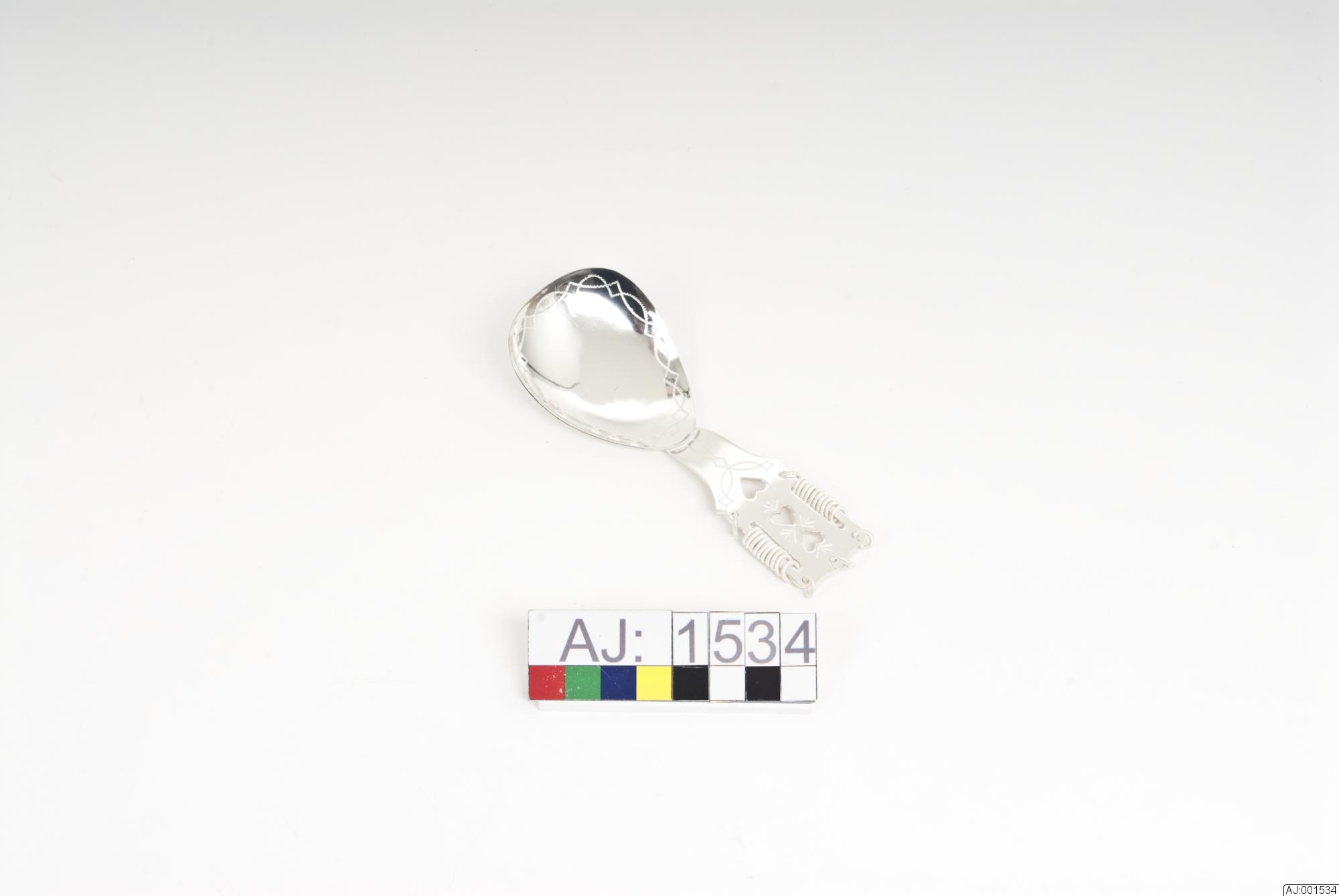 skeden har äggformat blad, ornerat på insidan med två svisselerade båglinjer runt kanten. Skaftet har tre genombrutna hjärtan, fem runda små hål från vilka det hänger ringar (en ring från varje runt hål) samt två avlånga hål på var sida om skaftet. Från de avlånga hålen hänger det totalt tjugo ringar (tio från varje avlångt hål). Totalt på hela skaftet sitter 25 ringar. (Alla ringar är vridna.) Skaftet har också graverad dekor; svisselerade linjer och bågar.