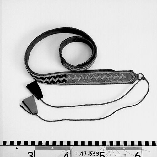 * Broderad del L 104 cm, skinnsnodd av 3 remsor L 77,5 cm, mässingring 2x2 cm, metallspänne 3x2,2 cm, skinntamp L 30 cm, B 2,5 cm.