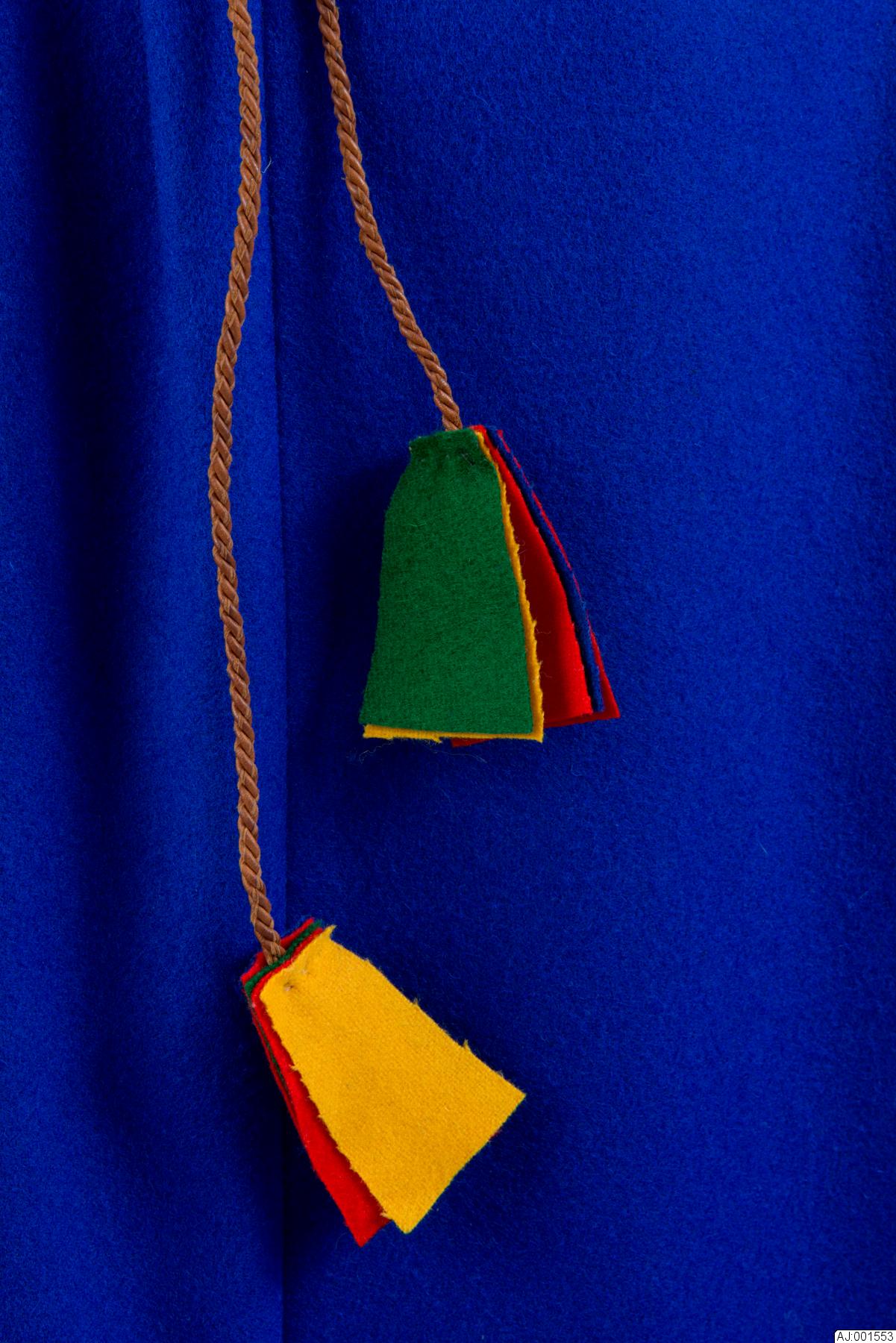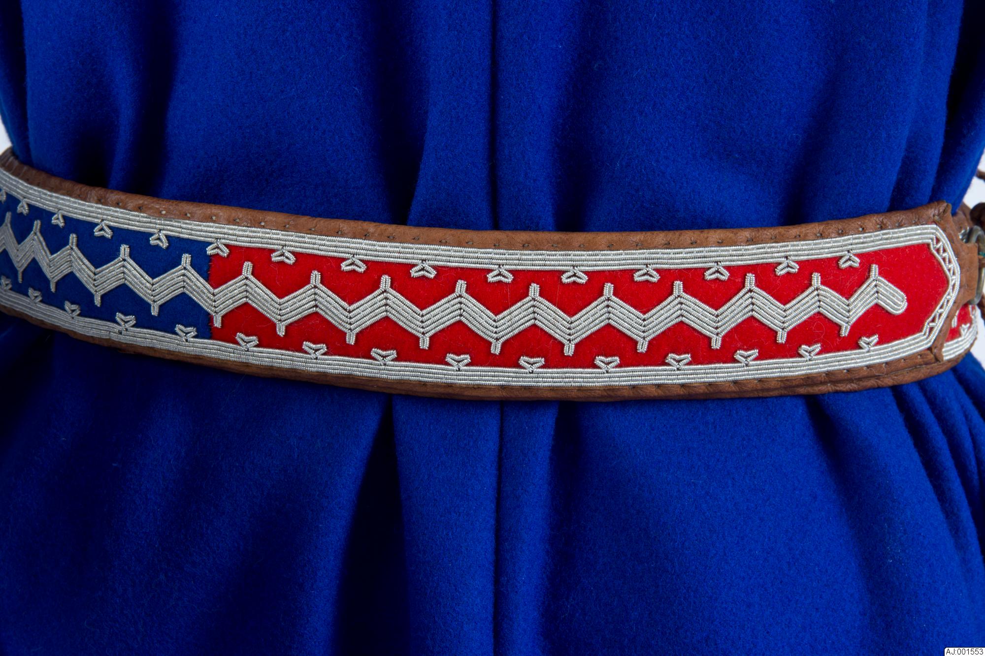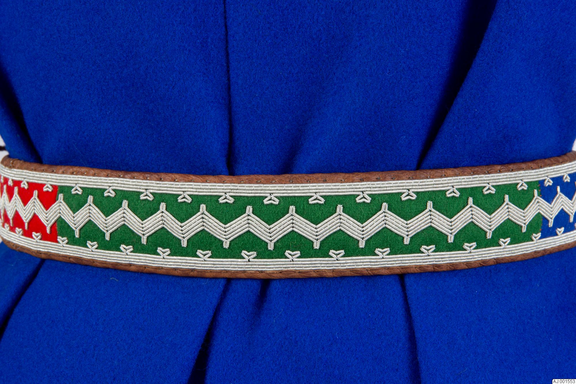 Kläde i rött, blått och grönt. De är hopsydda med röd sytråd. Bältet är fodrat med barkgarvat skinn, kanten vikt fram och sydd med syntettråd. Skinntamp av dubbelt skinn, sydd med syntettråd, tofs av kläde i rött, gult, blått och grönt sydd med syntettråd.