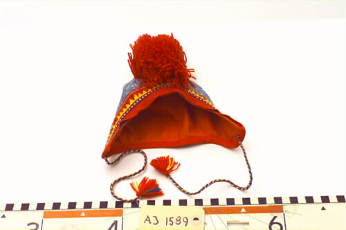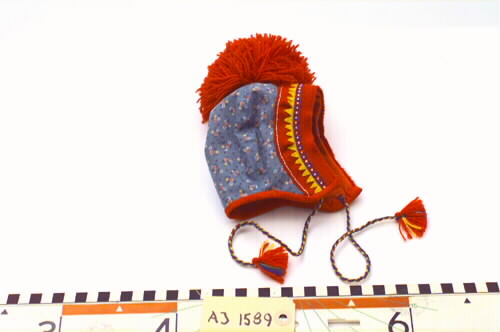 Tofs av rött syntetgarn. Knytband av ullgarn i rött, gult, grönt och blått. En liten tofs i vardera ände.