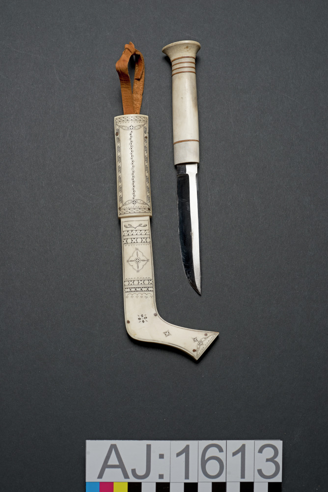1613:1-2 Helhornskniv av nordsamisk modell. Graverad på knivslidan (1613:2) och skaftet, gravyren är svartfärgad.