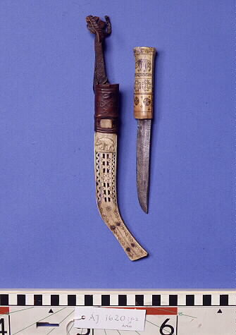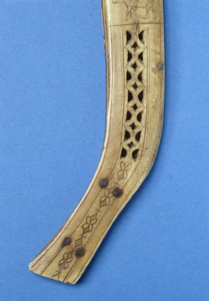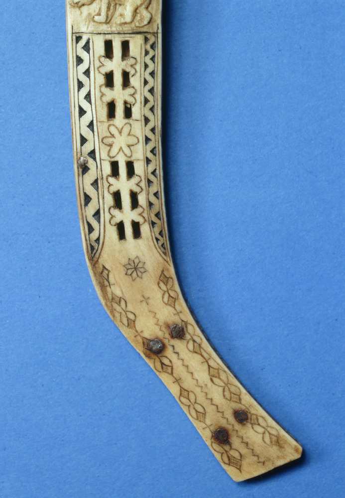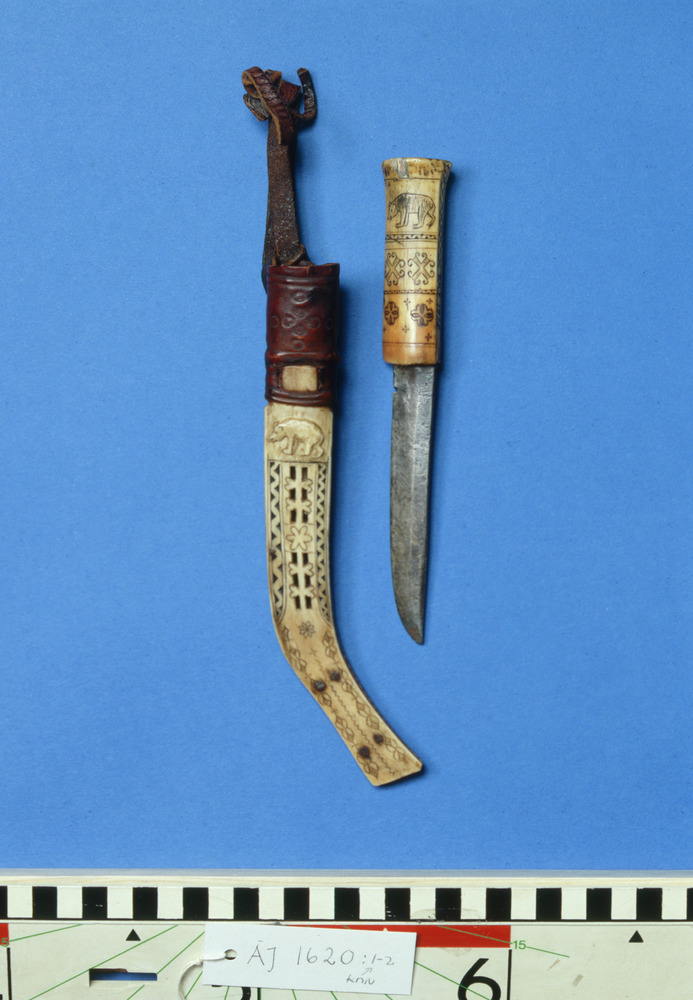 1620:2 Knivslidan genomskuret och graverat mönster. En björn är skuret i upphöjning på framsidan, nedanför skinnet. Bak är en ren graverad.
