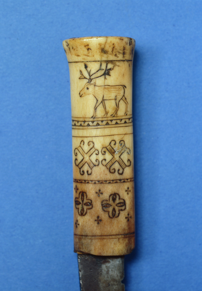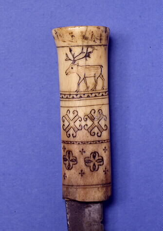 1620:1 Knivskaftet rikligt graverat. Initialerna P.K.F. 1918. På övre delen en ren och björn graverad.