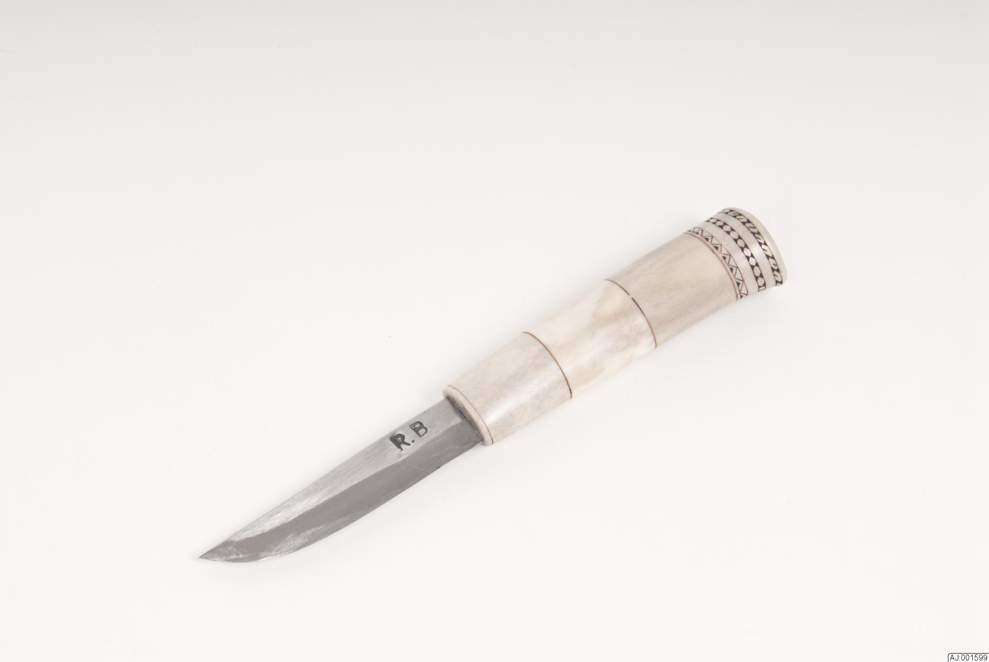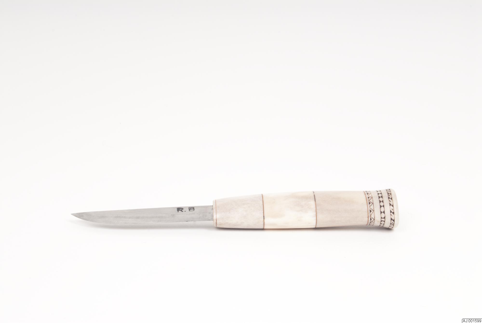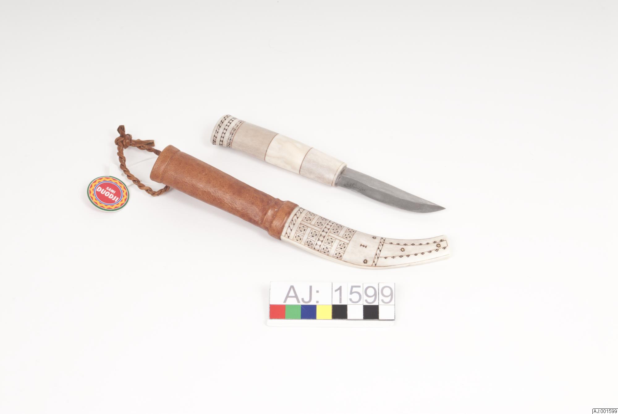 1599:1 Kniv med sydsamiskt mönster på knivslida och knivskaft. Knivbladet är märkt med R.B, skaftet är gjort av 4 delar med näver emellan. 1599:2 Knivslidan har gravyr på fram- och lite på baksidan. Den är hopsatt med 4 kopparnitar och är graverad runt om nitarna.