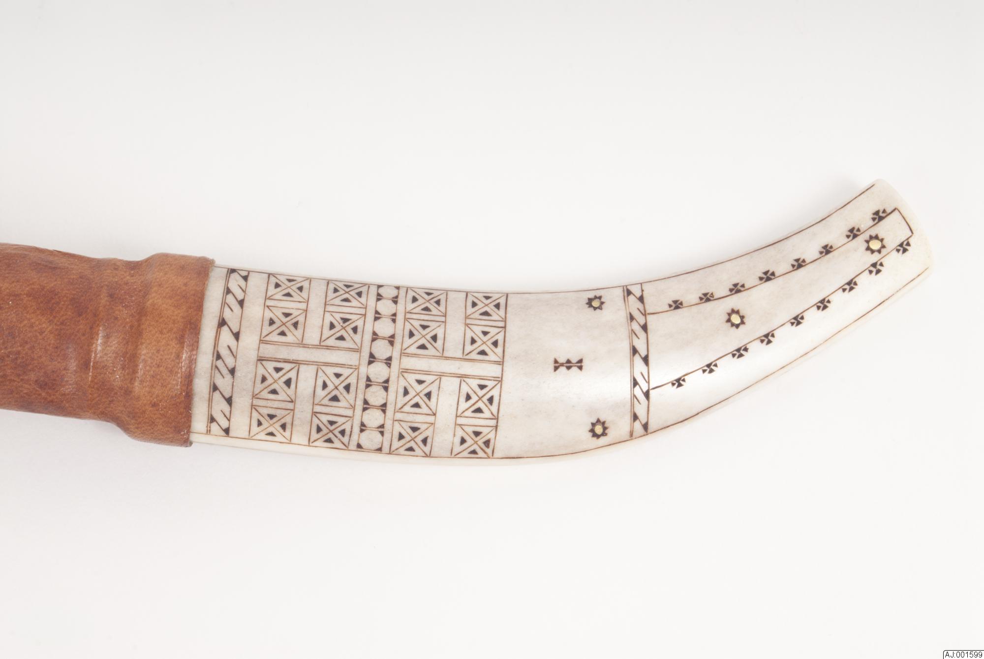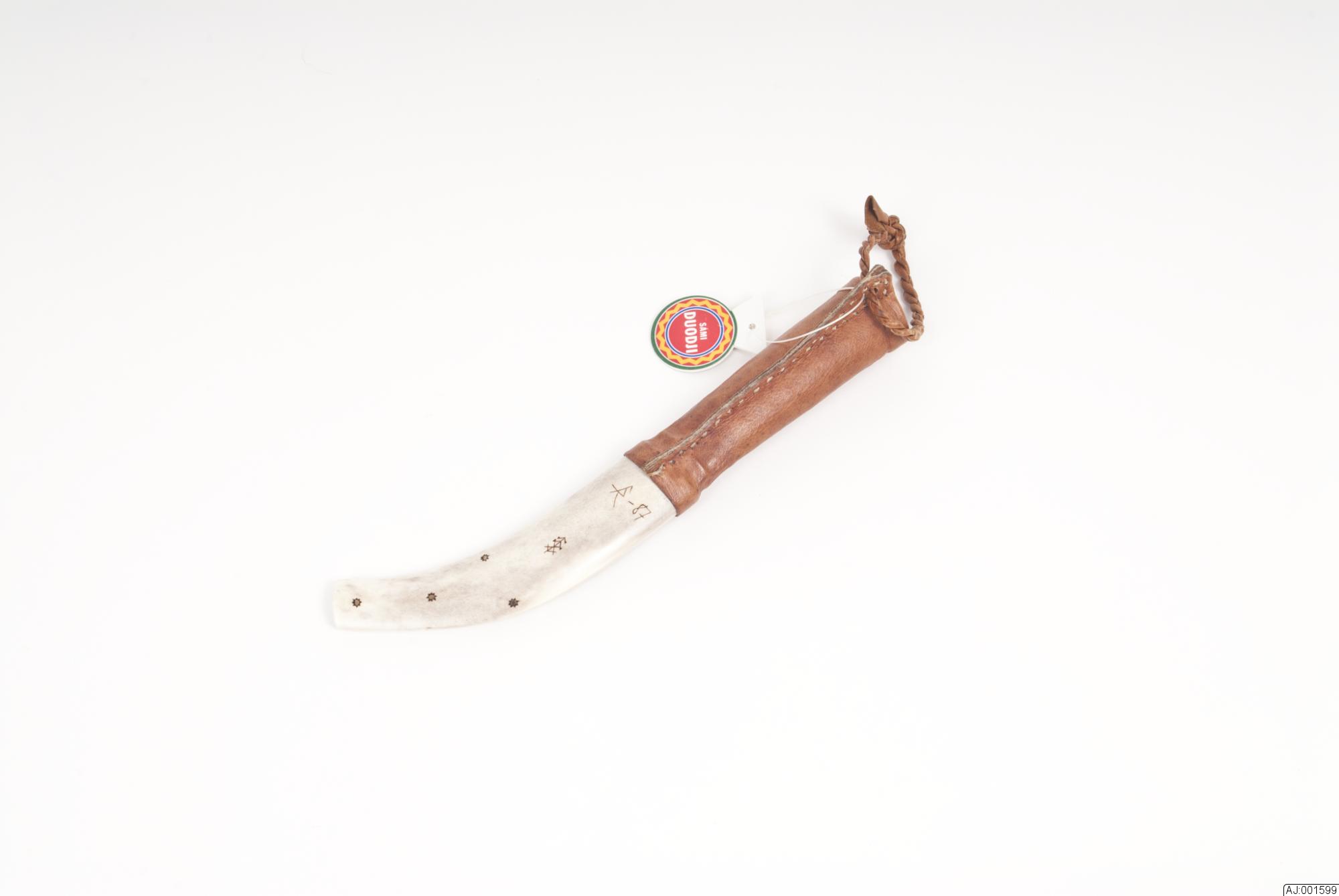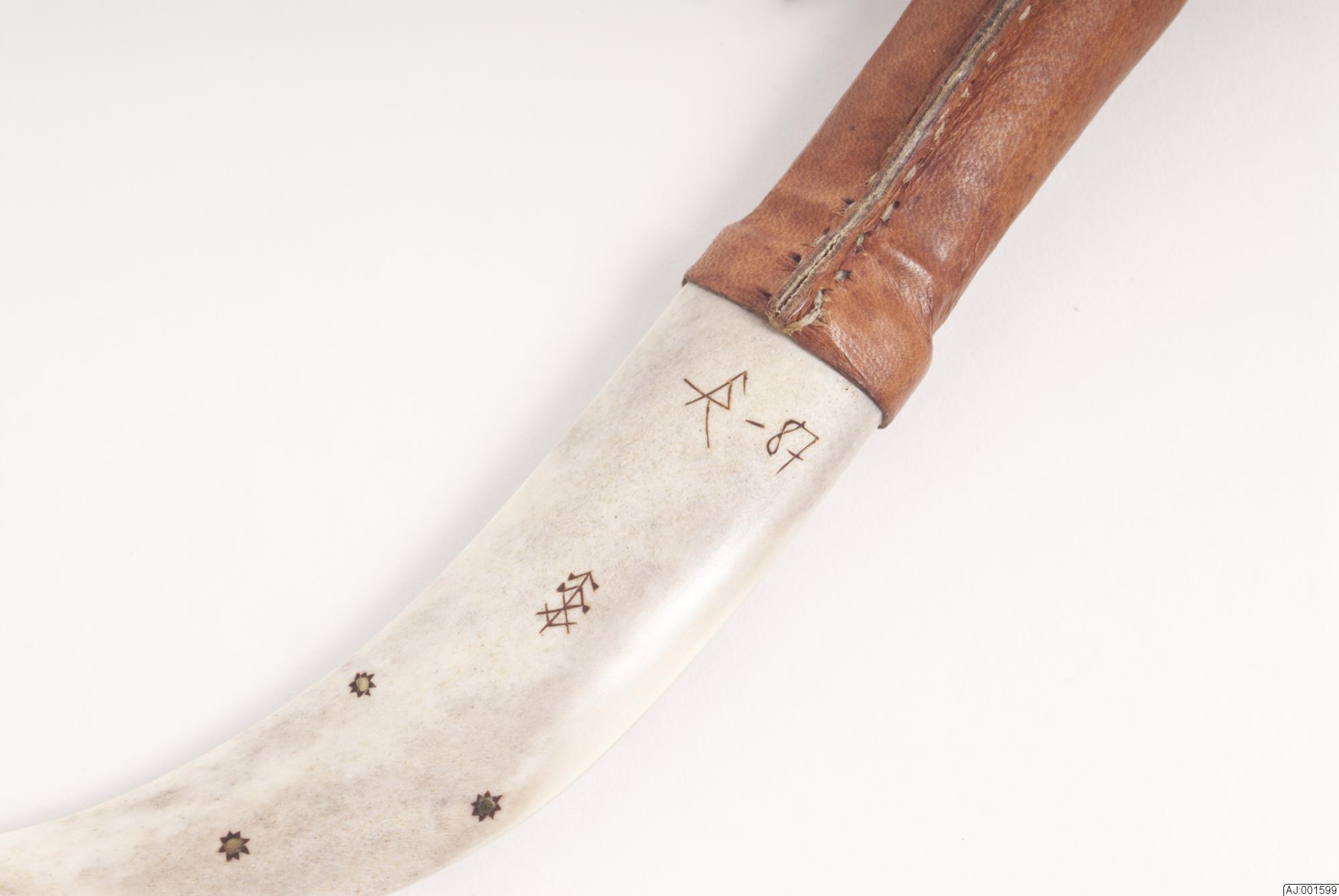 1599:1 Kniv med sydsamiskt mönster på knivslida och knivskaft. Knivbladet är märkt med R.B, skaftet är gjort av 4 delar med näver emellan. 1599:2 Knivslidan har gravyr på fram- och lite på baksidan. Den är hopsatt med 4 kopparnitar och är graverad runt om nitarna.