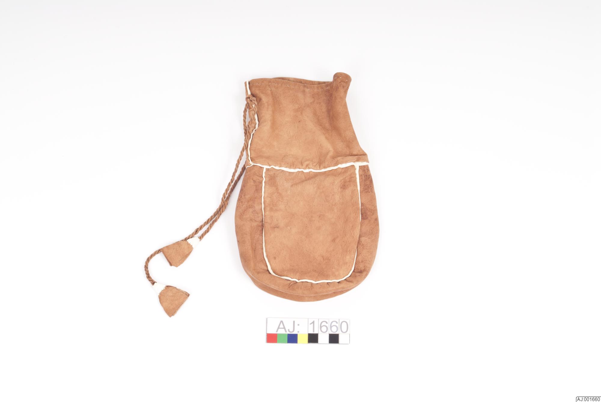 Kaffepåse, lulesamisk modell, sydd av barkgarvat skinn, med vitgarvat dubbelvikt skinn i sömmarna. Knytsnodd gjord av 3 remsor, tofs av skinn, initialer SRK, sydda på tofsen. Kaffepåsen är sydd med syntettråd.