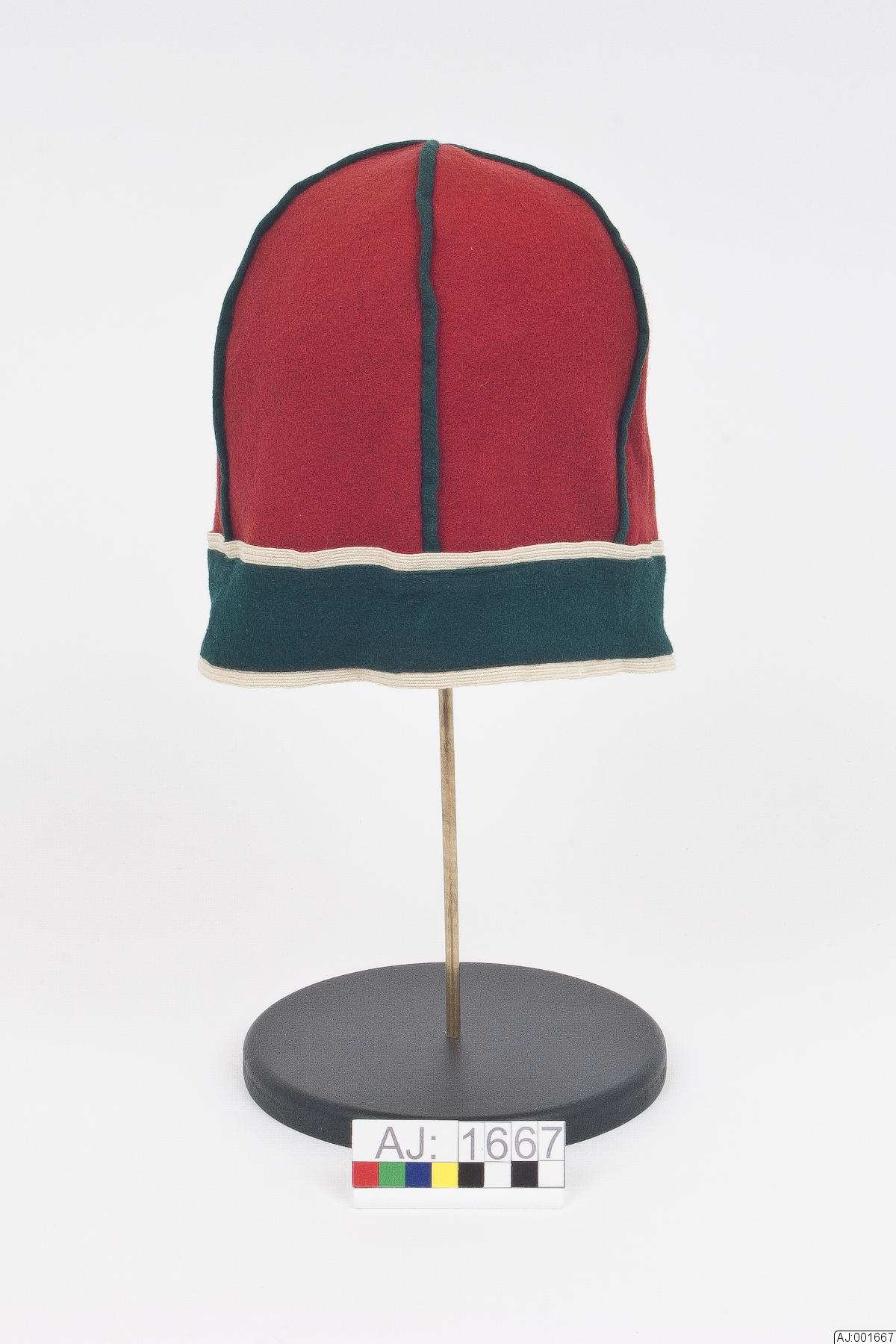 Mössa, sydd av 5 kilar i röd filt med grönt dubbelvikt kläde i sömmarna. Bård av grönt kläde med vitt, vävt ylleband ca 1 cm bred. Två små hål på kildel. Se skiss.