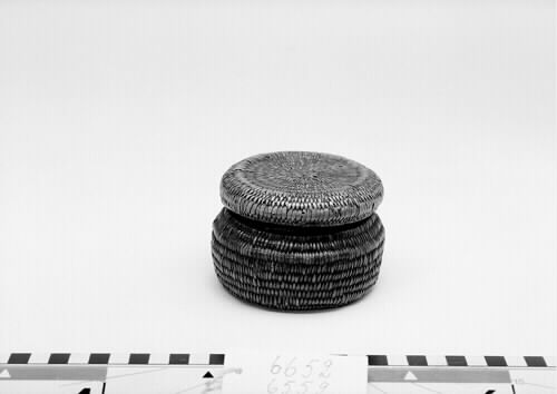 - Korg med lock. Rund. Tillverkad av kluvna gran- eller viderötter.