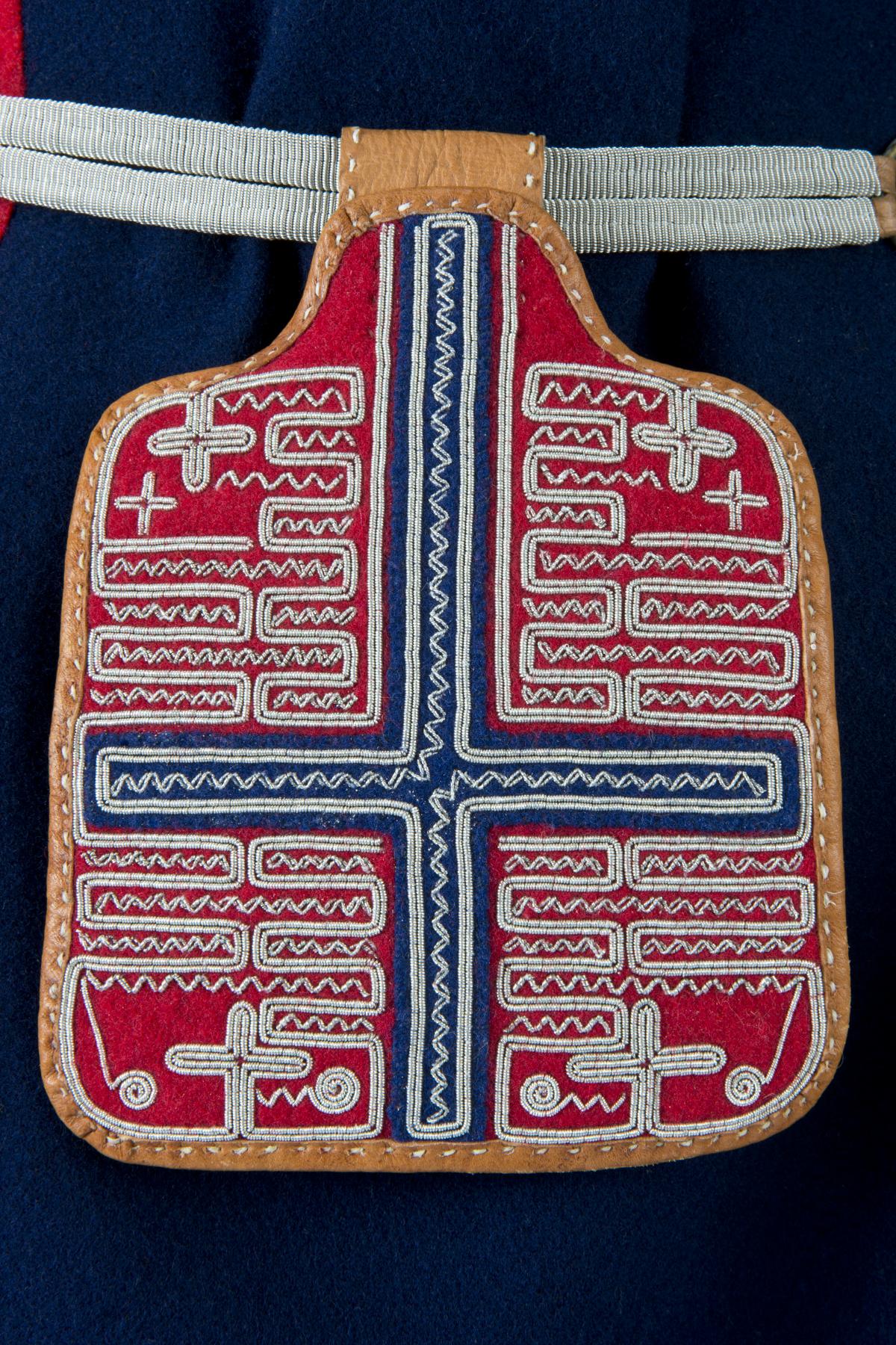 Skedväska sydd av garvat renskinn och sentråd. Skedväskan är sydd av ett stycke, med sömmar i sidor och dubbelvikt skinn som mellanlägg. Öppningen är 6,7 cm bred, med skinnkanten invikt och synlig söm. Locket har både rund och plattdragen tenntråd. Spunnen i olika grovlekar. Det är broderat på ett kors av blått kläde på rött kläde som botten. Locket är fodrat med skinn som är vikt mot framsidan och fastsytt med sentråd. Lock och väska är hopsatta med upphängningsöglan, som är sytt av dubbelt skinn.