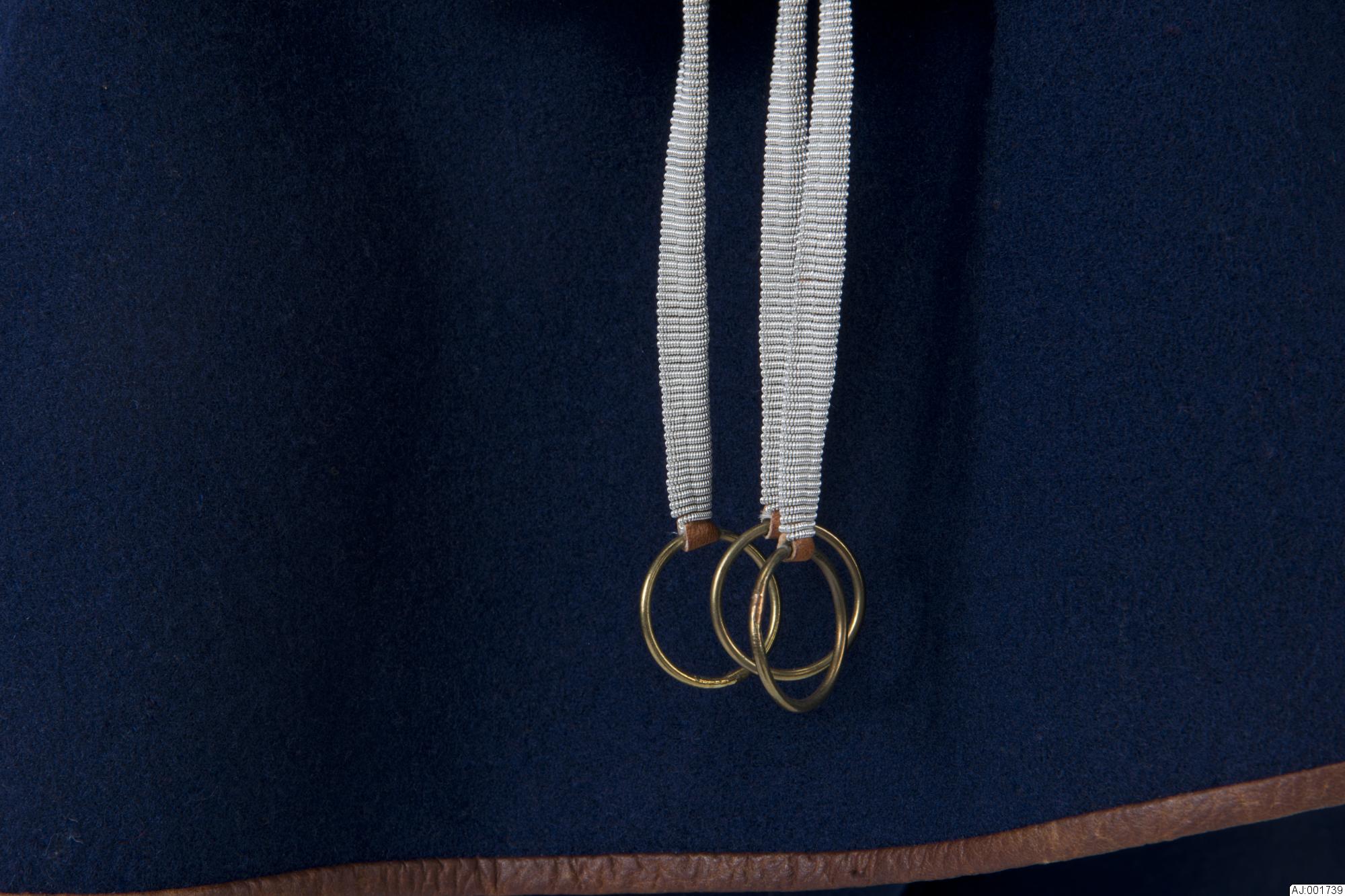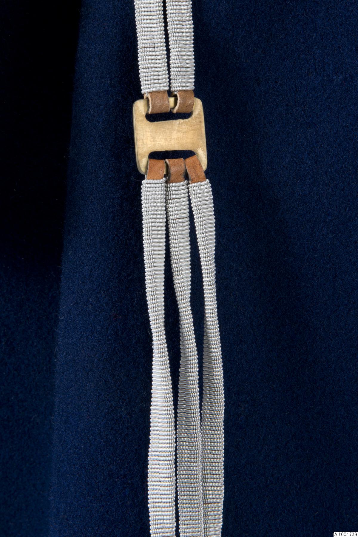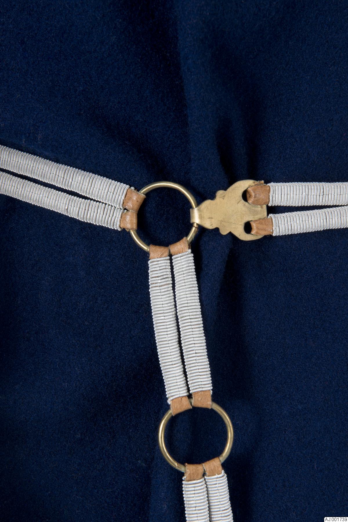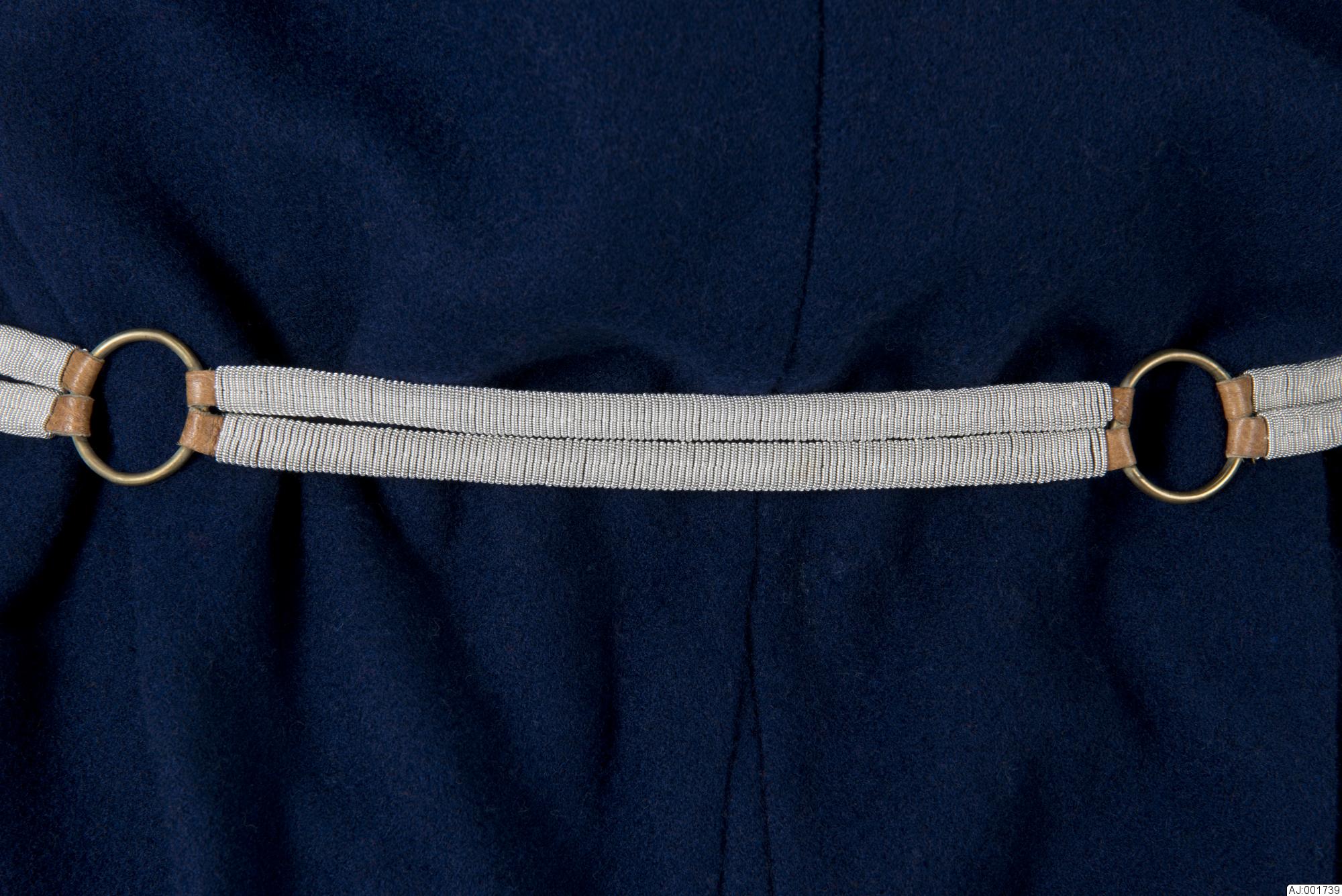 75 m tenntråd har använts. En söm sydd med syntettråd mitt på, längs efter delarna. från mässingplattan hänger 3 delar 0,6 cm breda och avslutas med mässingring 2 cmi diam. De övriga lederna är något bredare 0,7 cm. Midjemåttet kan varieras mellan ca 84 0ch 90,5 cm.