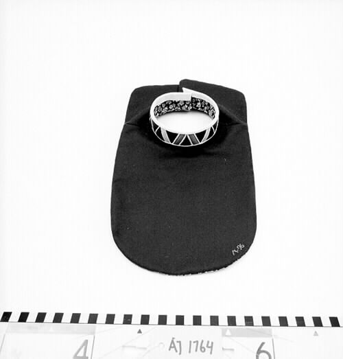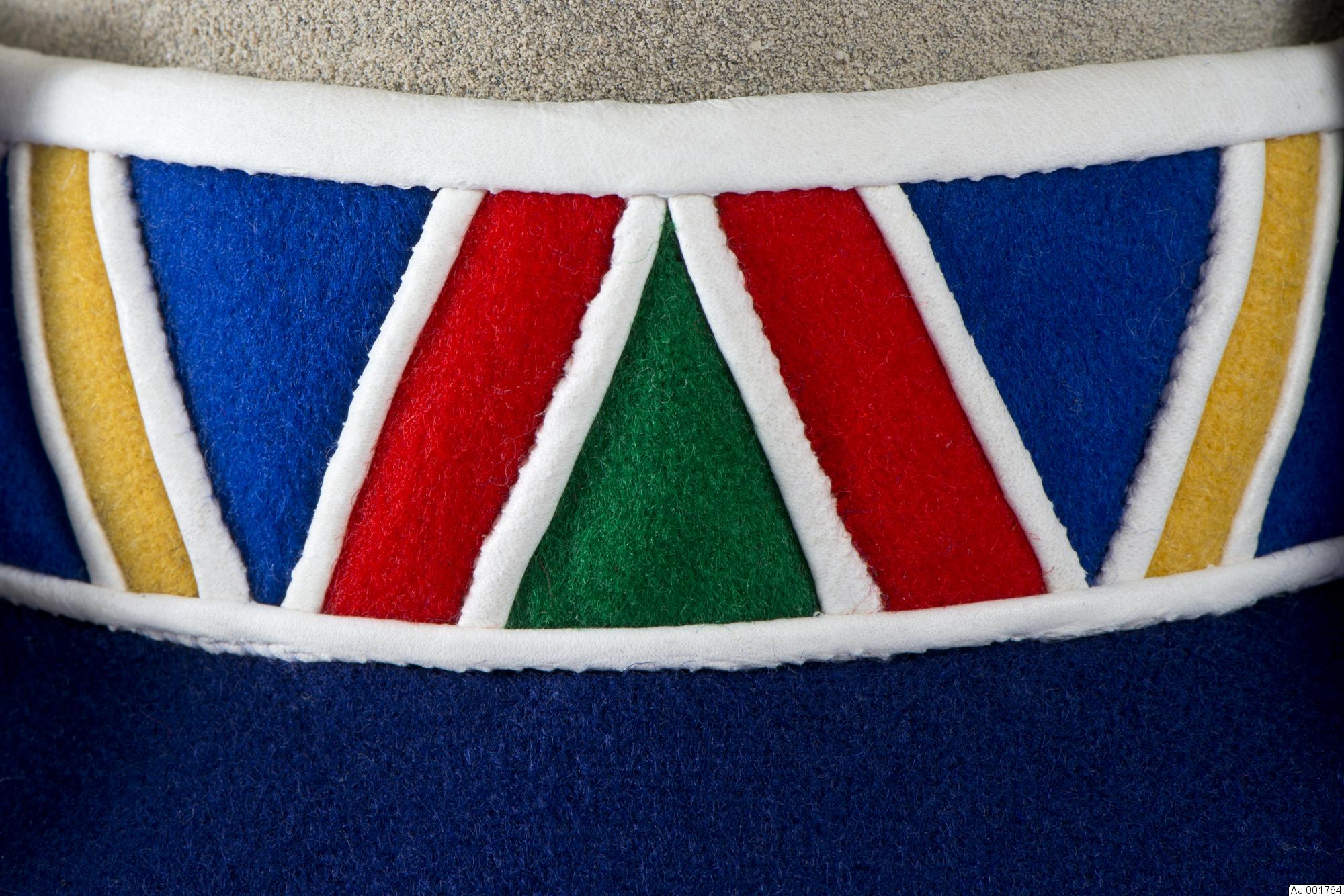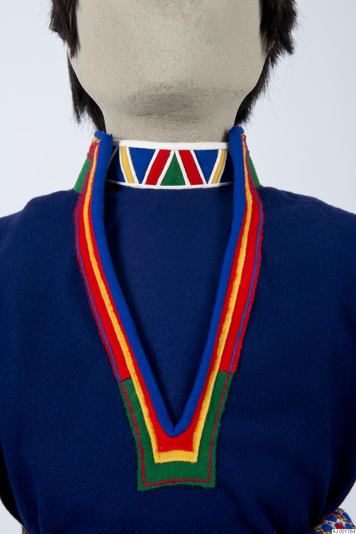 - Barmkläde (blå färg) för pojke ca 4 år. Kragen är sydd (kantad) med vitt skinn samt mellan dekorbitarna i kläde. Barmklädet är fodrat med blommigt bomullstyg i blått och vitt. Kragen har dekor i V-form.