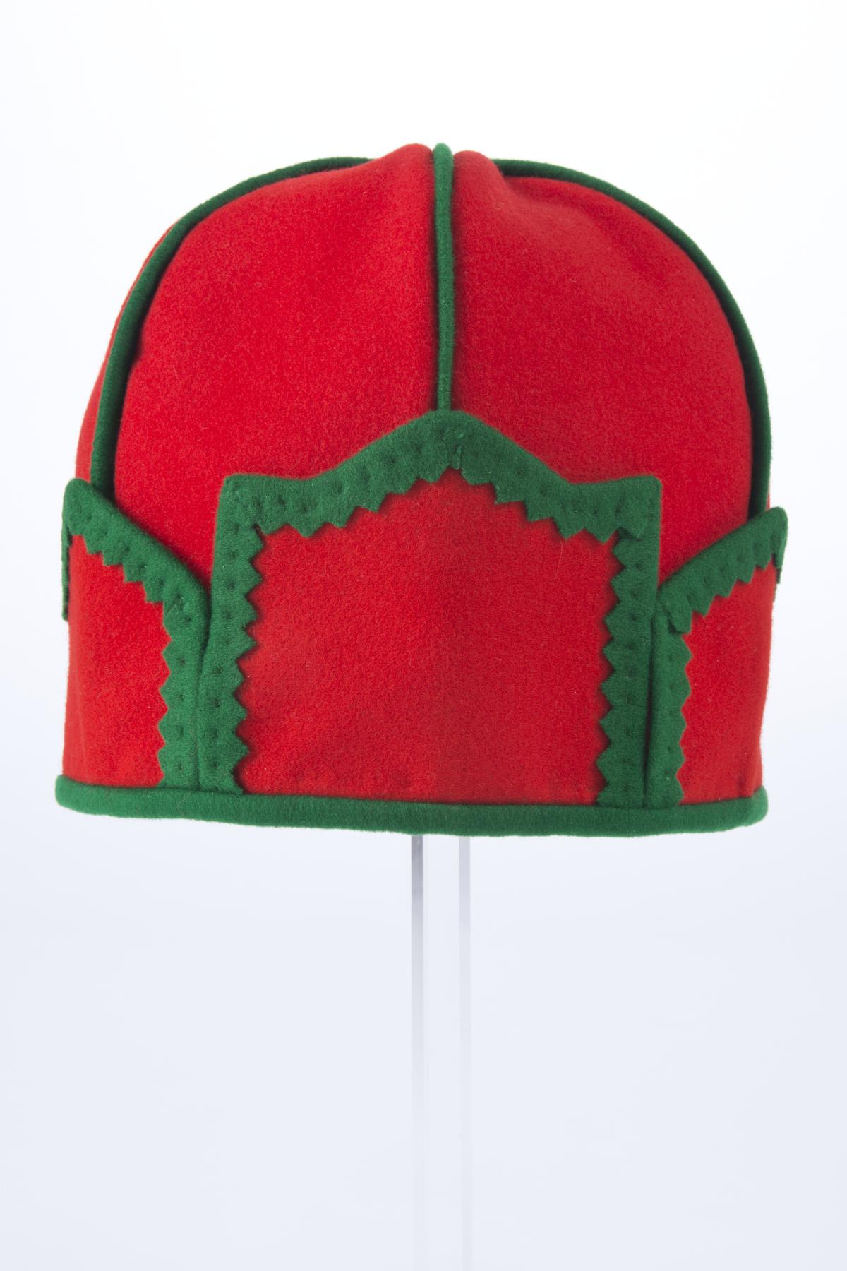 - En röd klädesmössa sydd av kilar i rött kläde med dubbelvikt grönt kläde i sömmarna. Mössan har bräm runtom av rött kläde med ett extra stycke för pannan. Brämet är kantat med zig-zackklippt grönt kläde.