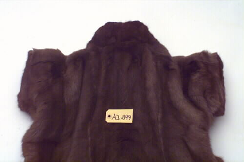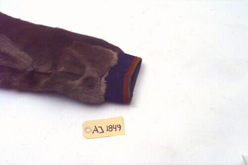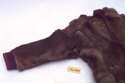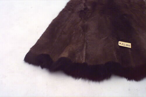 Pälskant av hundskinn. Upphängningsögla av vitt skinn fastsydd på kragens insida.