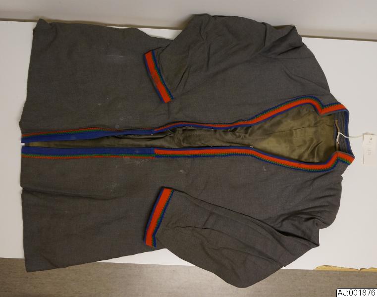 Sydsamisk manskolt. Öppen fram, med hyskor och hakar för stängning, från v-ringnen till midjan. Kolten i grått ulltyg. Dekorationer av rött, grönt och blått kläde. Klippta med sicksack-sax. Kolten har en ficka i sidsömmen på varje sida. I ryggsömmen ett litet veck i midjan.