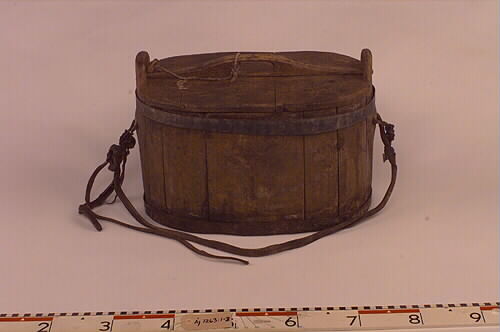 Oval kista med lock. Laggarna i järn, 2 stycken. På kortsidorna är det fäst en kraftig läderrem för bärning. Lock i trä med ett handtag högst upp och den går att "låsa" igen med en propp för låsning som är fastknytt med hampasnöre i lockets handtag. Inuti kistan ligger en påse med fiskfjäll från locket.
