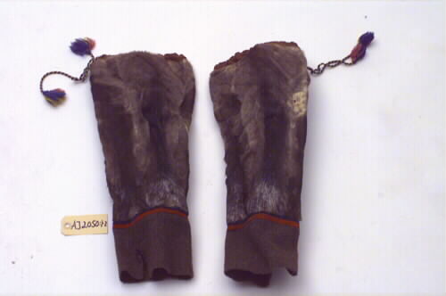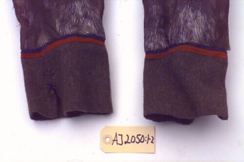 AJ 2050:1-2. Bällingholkar som upptill är kantade med garvat avhårat skinn som är sytt som en dragsko. Yllegarnsfläta i gult och blått i dragskon, tofs av rosa, gult och blått. Sytt med sentråd. Nertill ca 1 dm bred vadmalshals. Mellan skinn och vadmal är det dekorerat med kläde i rött och blått. Maskinsytt med röd och blå bomullstråd.