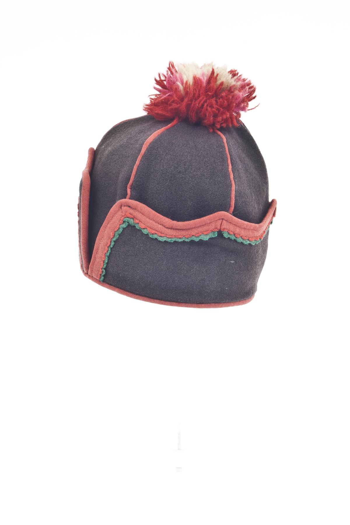 Sydsamisk mansmössa. Kilmössa av brunsvart ull, sydd av 6 kilar. Med mellanlägg av rött kläde i sömmarna. Öronlappar och skärm kantade med rött kläde och dekorerade med klippta uddkanter av grönt och rött kläde. . Garntofs av rött, vitt och rosa garn. Fodrad med bomullstyger, smårutigt och randigt. Sydd på maskin.