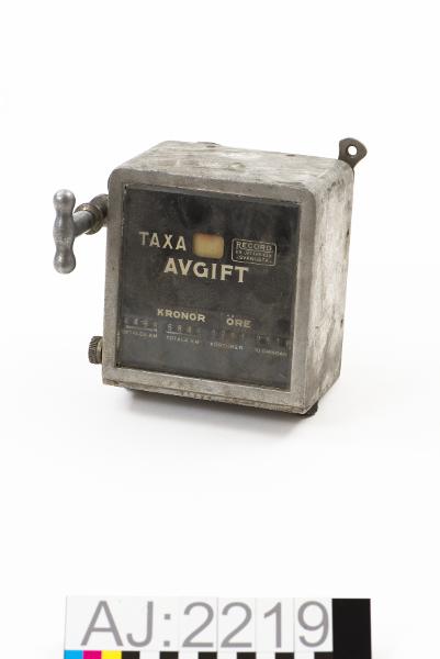 - fungerande taxameter med upphängningsanordning som sticker upp en bit baktill, till höger. Taxametern ser ut som en kub av metall med framsida av glas. Under glaset finns en svart platta med vit text. På översta raden står "TAXA (ruta) RECORD AB URFABRIKEN SVÄNGSTA". Man kan ändra texten i rutan genom att vrida på ett vred som sitter till vänster, de olika texterna är på röd botten och lyder "LEDIG" "F" "1" "2" "3" samt "KASSA". För alla texterna utom den första visas samtidigt siffror i rutor nedanför, under rutorna står "KRONOR" och "ÖRE". Den näst nedersta raden består av siffror i rutor och under dem står vad siffran anger, vilket utläses: "4488 BETALDA KM, 6845 TOTALA KM, 0711 KÖRTURER, 2516 10ÖRINGAR".