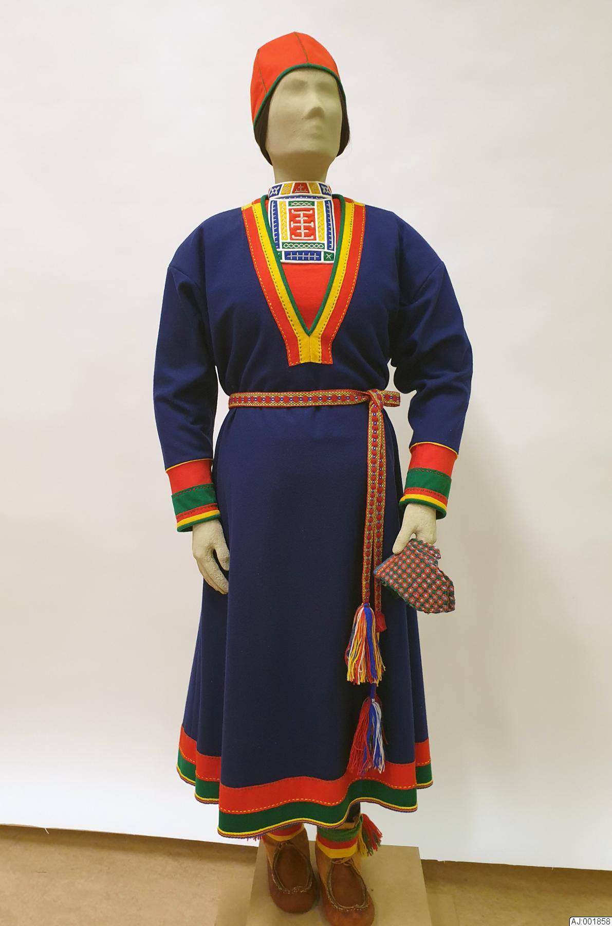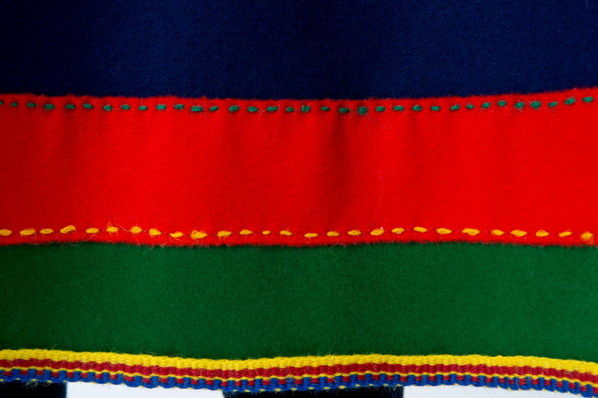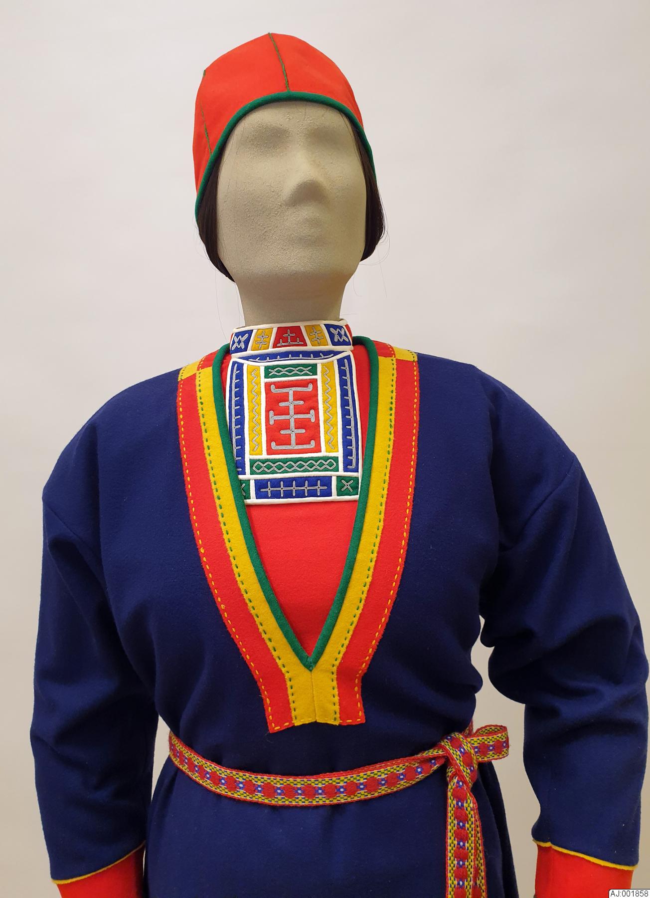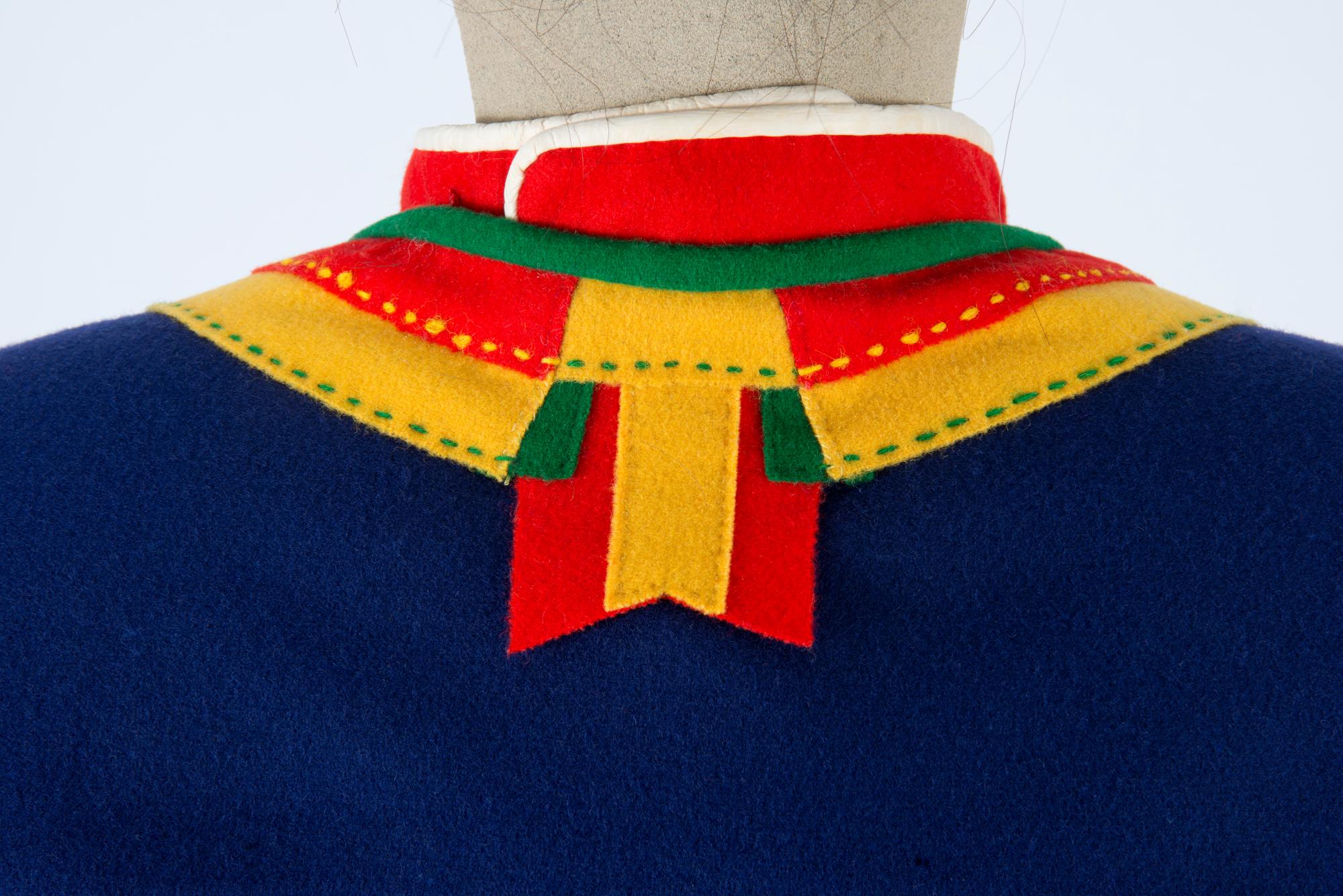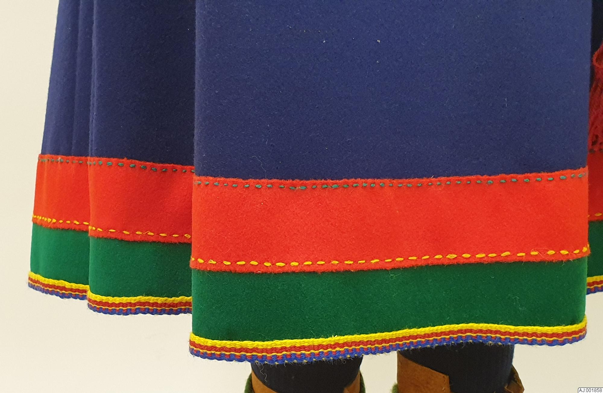 En kvinnokolt i Arjeplogsmodell i blått kläde med dekorationer i kläde och garn runt barm och armar samt längst ner på kolten där det även är en vävd lissto.